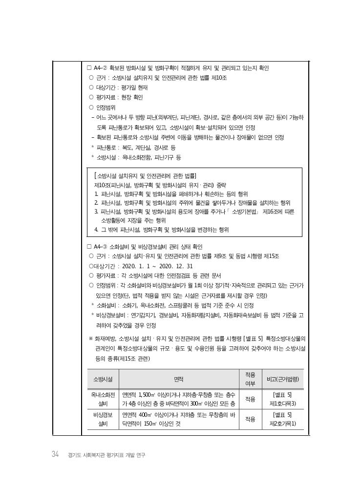 34 경기도 사회복지관 평가지표 개발 연구 소방시설 면적 적용 여부 비고(근거법령) 옥내소화전 설비 연면적 1,500㎡ 이상이거나 지하층・무창층 또는 층수 가 4층 이상인 층 중 바닥면적이 300㎡ 이상인 모든 층 적용 [별표 5] 제1호다목3) 비상경보 설비 연면적 400㎡ 이상이거나 지하층 또는 무창층의 바 닥면적이 150㎡ 이상인 것 적용 [별표 5] 제2호가목1) □ A4-② 확보된 방화시설 및 방화구획이 적절하게 유지 및 관리되고 있는지 확인 ○ 근거 : 소방시설 설치유지 및 안전관리에 관한 법률 제10조 ○ 대상기간 : 평가일 현재 ○ 평가자료 : 현장 확인 ○ 인정범위 - 어느 곳에서나 두 방향 피난(외부계단, 피난계단, 경사로, 같은 층에서의 외부 공간 등)이 가능하 도록 피난통로가 확보되어 있고, 소방시설이 확보・설치되어 있으면 인정 - 확보된 피난통로와 소방시설 주변에 이동을 방해하는 물건이나 장애물이 없으면 인정 * 피난통로 : 복도, 계단실, 경사로 등 * 소방시설 : 옥내소화전함, 피난기구 등 [소방시설 설치유지 및 안전관리에 관한 법률] 제10조(피난시설, 방화구획 및 방화시설의 유지ㆍ관리) 중략 1. 피난시설, 방화구획 및 방화시설을 폐쇄하거나 훼손하는 등의 행위 2. 피난시설, 방화구획 및 방화시설의 주위에 물건을 쌓아두거나 장애물을 설치하는 행위 3. 피난시설, 방화구획 및 방화시설의 용도에 장애를 주거나 「소방기본법」 제16조에 따른 소방활동에 지장을 주는 행위 4. 그 밖에 피난시설, 방화구획 및 방화시설을 변경하는 행위 □ A4-③ 소화설비 및 비상경보설비 관리 상태 확인 ○ 근거 : 소방시설 설치・유지 및 안전관리에 관한 법률 제9조 및 동법 시행령 제15조 ○대상기간 : 2020. 1. 1 ~ 2020. 12. 31 ○ 평가자료 : 각 소방시설에 대한 안전점검표 등 관련 문서 ○ 인정범위 : 각 소화설비와 비상경보설비가 월 1회 이상 정기적・지속적으로 관리되고 있는 근거가 있으면 인정(단, 법적 적용을 받지 않는 시설은 근거자료를 제시할 경우 인정) * 소화설비 : 소화기, 옥내소화전, 스프링쿨러 등 법적 기준 준수 시 인정 * 비상경보설비 : 연기감지기, 경보설비, 자동화재탐지설비, 자동화재속보설비 등 법적 기준을 고 려하여 갖추었을 경우 인정 ※ 화재예방, 소방시설 설치ㆍ유지 및 안전관리에 관한 법률 시행령 [별표 5] 특정소방대상물의 관계인이 특정소방대상물의 규모ㆍ용도 및 수용인원 등을 고려하여 갖추어야 하는 소방시설 등의 종류(제15조 관련)