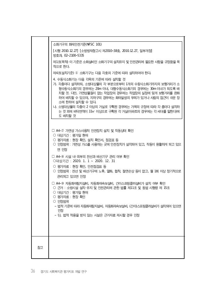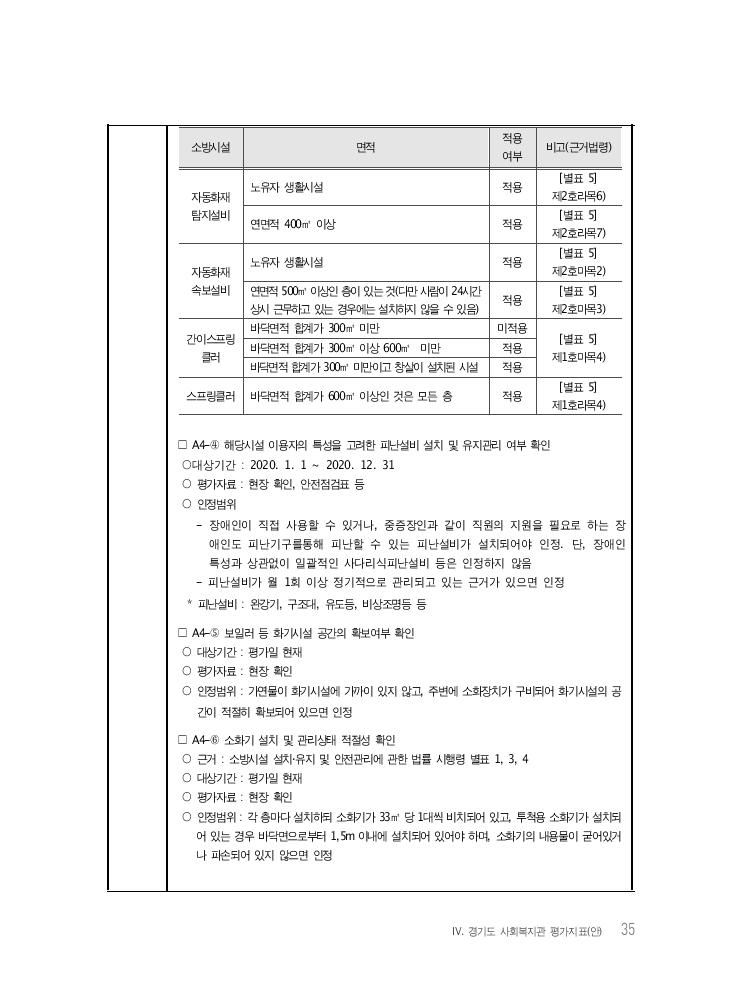 Ⅳ. 경기도 사회복지관 평가지표(안) 35 소방시설 면적 적용 여부 비고(근거법령) 자동화재 탐지설비 노유자 생활시설 적용 [별표 5]제2호라목6) 연면적 400㎡ 이상 적용 [별표 5]제2호라목7) 자동화재 속보설비 노유자 생활시설 적용 [별표 5]제2호마목2) 연면적 500㎡ 이상인 층이 있는 것(다만 사람이 24시간 상시 근무하고 있는 경우에는 설치하지 않을 수 있음) 적용 [별표 5] 제2호마목3) 간이스프링 클러 바닥면적 합계가 300㎡ 미만 미적용 [별표 5] 제1호마목4)바닥면적 합계가 300㎡ 이상 600㎡ 미만 적용 바닥면적 합계가 300㎡ 미만이고 창살이 설치된 시설 적용 스프링클러 바닥면적 합계가 600㎡ 이상인 것은 모든 층 적용 [별표 5]제1호라목4) □ A4-④ 해당시설 이용자의 특성을 고려한 피난설비 설치 및 유지관리 여부 확인 ○대상기간 : 2020. 1. 1 ~ 2020. 12. 31 ○ 평가자료 : 현장 확인, 안전점검표 등 ○ 인정범위 - 장애인이 직접 사용할 수 있거나, 중증장인과 같이 직원의 지원을 필요로 하는 장 애인도 피난기구를통해 피난할 수 있는 피난설비가 설치되어야 인정. 단, 장애인 특성과 상관없이 일괄적인 사다리식피난설비 등은 인정하지 않음 - 피난설비가 월 1회 이상 정기적으로 관리되고 있는 근거가 있으면 인정 * 피난설비 : 완강기, 구조대, 유도등, 비상조명등 등 □ A4-⑤ 보일러 등 화기시설 공간의 확보여부 확인 ○ 대상기간 : 평가일 현재 ○ 평가자료 : 현장 확인 ○ 인정범위 : 가연물이 화기시설에 가까이 있지 않고, 주변에 소화장치가 구비되어 화기시설의 공 간이 적절히 확보되어 있으면 인정 □ A4-⑥ 소화기 설치 및 관리상태 적절성 확인 ○ 근거 : 소방시설 설치‧유지 및 안전관리에 관한 법률 시행령 별표 1, 3, 4 ○ 대상기간 : 평가일 현재 ○ 평가자료 : 현장 확인 ○ 인정범위 : 각 층마다 설치하되 소화기가 33㎡ 당 1대씩 비치되어 있고, 투척용 소화기가 설치되 어 있는 경우 바닥면으로부터 1,5m 이내에 설치되어 있어야 하며, 소화기의 내용물이 굳어있거 나 파손되어 있지 않으면 인정