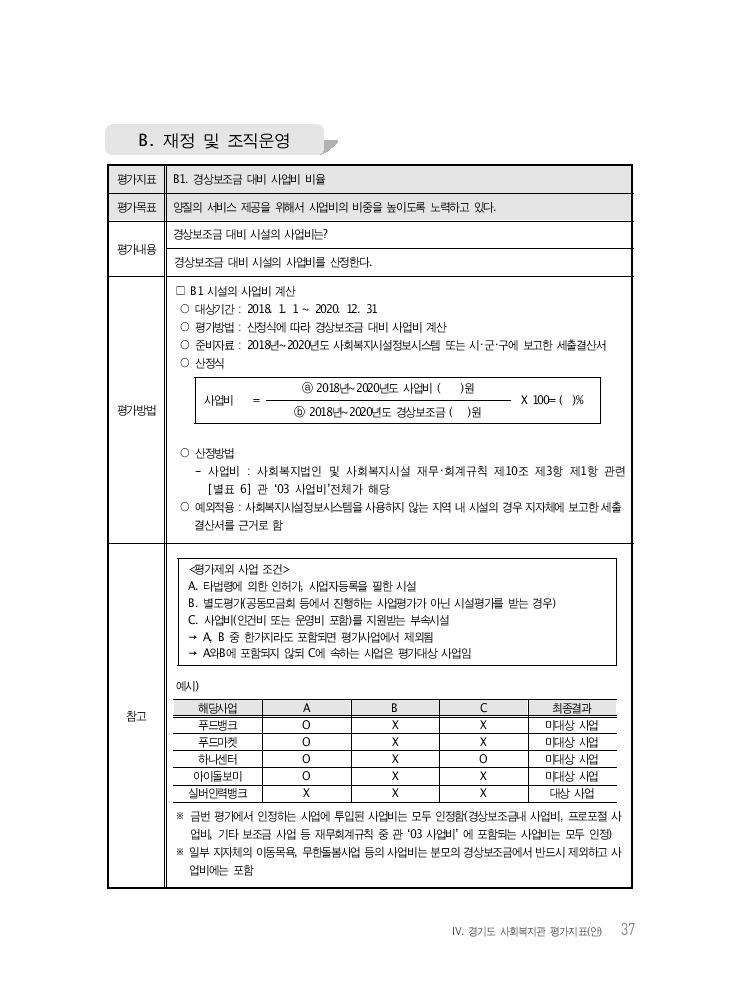 Ⅳ. 경기도 사회복지관 평가지표(안) 37 B. 재정 및 조직운영 평가지표 B1. 경상보조금 대비 사업비 비율 평가목표 양질의 서비스 제공을 위해서 사업비의 비중을 높이도록 노력하고 있다. 평가내용 경상보조금 대비 시설의 사업비는? 경상보조금 대비 시설의 사업비를 산정한다. 평가방법 사업비 = ⓐ 2018년~2020년도 사업비 ( )원 X 100= ( )% ⓑ 2018년~2020년도 경상보조금 ( )원 □ B1 시설의 사업비 계산 ○ 대상기간 : 2018. 1. 1 ~ 2020. 12. 31 ○ 평가방법 : 산정식에 따라 경상보조금 대비 사업비 계산 ○ 준비자료 : 2018년~2020년도 사회복지시설정보시스템 또는 시・군・구에 보고한 세출결산서 ○ 산정식 ○ 산정방법 - 사업비 : 사회복지법인 및 사회복지시설 재무・회계규칙 제10조 제3항 제1항 관련 [별표 6] 관 ‘03 사업비’전체가 해당 ○ 예외적용 : 사회복지시설정보시스템을 사용하지 않는 지역 내 시설의 경우 지자체에 보고한 세출 결산서를 근거로 함 참고 <평가제외 사업 조건> A. 타법령에 의한 인허가, 사업자등록을 필한 시설 B. 별도평가(공동모금회 등에서 진행하는 사업평가가 아닌 시설평가를 받는 경우) C. 사업비(인건비 또는 운영비 포함)를 지원받는 부속시설 → A, B 중 한가지라도 포함되면 평가사업에서 제외됨 → A와B에 포함되지 않되 C에 속하는 사업은 평가대상 사업임 예시) 해당사업 A B C 최종결과 푸드뱅크 O X X 미대상 사업 푸드마켓 O X X 미대상 사업 하나센터 O X O 미대상 사업 아이돌보미 O X X 미대상 사업 실버인력뱅크 X X X 대상 사업 ※ 금번 평가에서 인정하는 사업에 투입된 사업비는 모두 인정함(경상보조금내 사업비, 프로포절 사 업비, 기타 보조금 사업 등 재무회계규칙 중 관 ‘03 사업비’ 에 포함되는 사업비는 모두 인정) ※ 일부 지자체의 이동목욕, 무한돌봄사업 등의 사업비는 분모의 경상보조금에서 반드시 제외하고 사 업비에는 포함