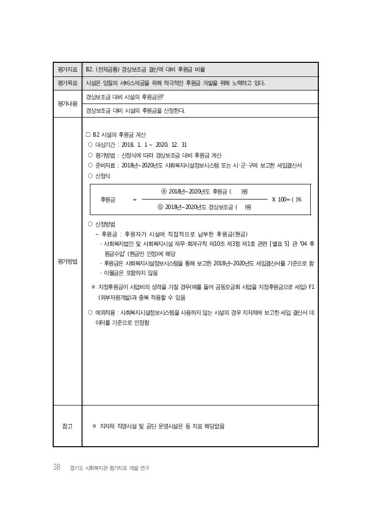 38 경기도 사회복지관 평가지표 개발 연구 평가지표 B2. (전체공통) 경상보조금 결산액 대비 후원금 비율 평가목표 시설은 양질의 서비스제공을 위해 적극적인 후원금 개발을 위해 노력하고 있다. 평가내용 경상보조금 대비 시설의 후원금은? 경상보조금 대비 시설의 후원금을 산정한다. 평가방법 □ B2 시설의 후원금 계산 ○ 대상기간 : 2018. 1. 1 ~ 2020. 12. 31 ○ 평가방법 : 산정식에 따라 경상보조금 대비 후원금 계산 ○ 준비자료 : 2018년~2020년도 사회복지시설정보시스템 또는 시・군・구에 보고한 세입결산서 ○ 산정식 후원금 = ⓐ 2018년~2020년도 후원금 ( )원 X 100= ( )% ⓑ 2018년~2020년도 경상보조금 ( )원 ○ 산정방법 - 후원금 : 후원자가 시설에 직접적으로 납부한 후원금(현금) · 사회복지법인 및 사회복지시설 재무・회계규칙 제10조 제3항 제1호 관련 [별표 5] 관 ’04 후 원금수입’ (현금만 인정)에 해당 · 후원금은 사회복지시설정보시스템을 통해 보고한 2018년~2020년도 세입결산서를 기준으로 함 · 이월금은 포함하지 않음 ※ 지정후원금이 사업비의 성격을 가질 경우(예를 들어 공동모금회 사업을 지정후원금으로 세입) F1 (외부자원개발)과 중복 적용할 수 있음 ○ 예외적용 : 사회복지시설정보시스템을 사용하지 않는 시설의 경우 지자체에 보고한 세입 결산서 데 이터를 기준으로 인정함 참고 ※ 지자체 직영시설 및 공단 운영시설은 동 지표 해당없음
