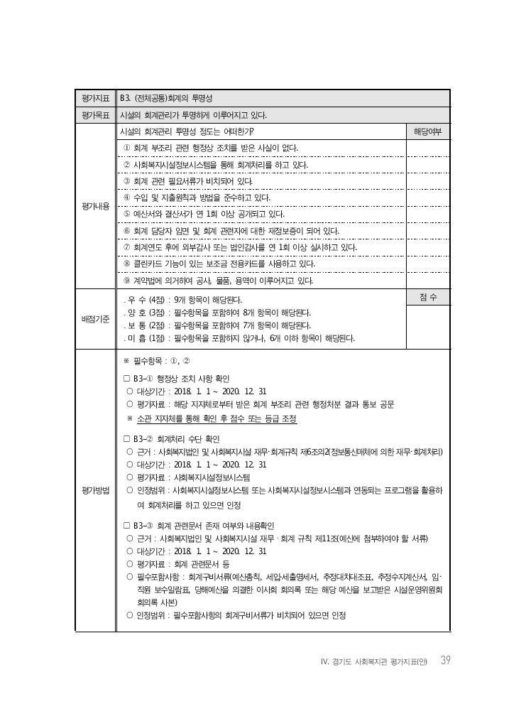 Ⅳ. 경기도 사회복지관 평가지표(안) 39 평가지표 B3. (전체공통)회계의 투명성 평가목표 시설의 회계관리가 투명하게 이루어지고 있다. 평가내용 시설의 회계관리 투명성 정도는 어떠한가? 해당여부 ① 회계 부조리 관련 행정상 조치를 받은 사실이 없다. ② 사회복지시설정보시스템을 통해 회계처리를 하고 있다. ③ 회계 관련 필요서류가 비치되어 있다. ④ 수입 및 지출원칙과 방법을 준수하고 있다. ⑤ 예산서와 결산서가 연 1회 이상 공개되고 있다. ⑥ 회계 담당자 임면 및 회계 관련자에 대한 재정보증이 되어 있다. ⑦ 회계연도 후에 외부감사 또는 법인감사를 연 1회 이상 실시하고 있다. ⑧ 클린카드 기능이 있는 보조금 전용카드를 사용하고 있다. ⑨ 계약법에 의거하여 공사, 물품, 용역이 이루어지고 있다. 배점기준 ․ 우 수 (4점) : 9개 항목이 해당된다. ․ 양 호 (3점) : 필수항목을 포함하여 8개 항목이 해당된다. ․ 보 통 (2점) : 필수항목을 포함하여 7개 항목이 해당된다. ․ 미 흡 (1점) : 필수항목을 포함하지 않거나, 6개 이하 항목이 해당된다. 점 수 평가방법 ※ 필수항목 : ①, ② □ B3-① 행정상 조치 사항 확인 ○ 대상기간 : 2018. 1. 1 ~ 2020. 12. 31 ○ 평가자료 : 해당 지자체로부터 받은 회계 부조리 관련 행정처분 결과 통보 공문 ※ 소관 지자체를 통해 확인 후 점수 또는 등급 조정 □ B3-② 회계처리 수단 확인 ○ 근거 : 사회복지법인 및 사회복지시설 재무・회계규칙 제6조의2(정보통신매체에 의한 재무・회계처리) ○ 대상기간 : 2018. 1. 1 ~ 2020. 12. 31 ○ 평가자료 : 사회복지시설정보시스템 ○ 인정범위 : 사회복지시설정보시스템 또는 사회복지시설정보시스템과 연동되는 프로그램을 활용하 여 회계처리를 하고 있으면 인정 □ B3-③ 회계 관련문서 존재 여부와 내용확인 ○ 근거 : 사회복지법인 및 사회복지시설 재무ㆍ회계 규칙 제11조(예산에 첨부하여야 할 서류) ○ 대상기간 : 2018. 1. 1 ~ 2020. 12. 31 ○ 평가자료 : 회계 관련문서 등 ○ 필수포함사항 : 회계구비서류(예산총칙, 세입‧세출명세서, 추정대차대조표, 추정수지계산서, 임・ 직원 보수일람표, 당해예산을 의결한 이사회 회의록 또는 해당 예산을 보고받은 시설운영위원회 회의록 사본) ○ 인정범위 : 필수포함사항의 회계구비서류가 비치되어 있으면 인정