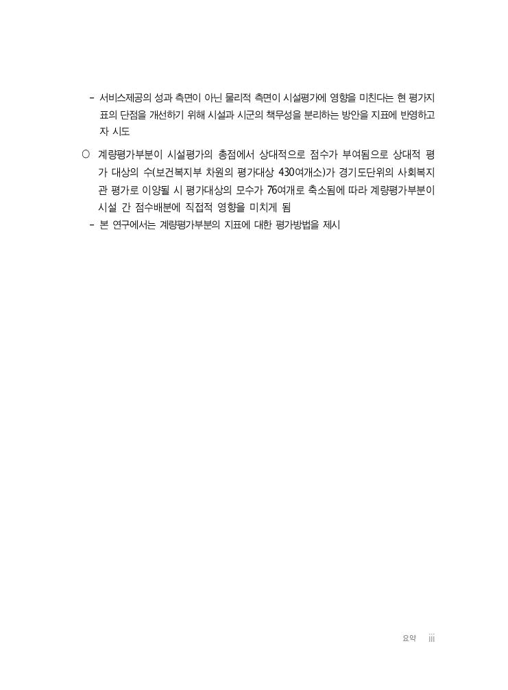 요약 iii - 서비스제공의 성과 측면이 아닌 물리적 측면이 시설평가에 영향을 미친다는 현 평가지 표의 단점을 개선하기 위해 시설과 시군의 책무성을 분리하는 방안을 지표에 반영하고 자 시도 ○ 계량평가부분이 시설평가의 총점에서 상대적으로 점수가 부여됨으로 상대적 평 가 대상의 수(보건복지부 차원의 평가대상 430여개소)가 경기도단위의 사회복지 관 평가로 이양될 시 평가대상의 모수가 76여개로 축소됨에 따라 계량평가부분이 시설 간 점수배분에 직접적 영향을 미치게 됨 - 본 연구에서는 계량평가부분의 지표에 대한 평가방법을 제시