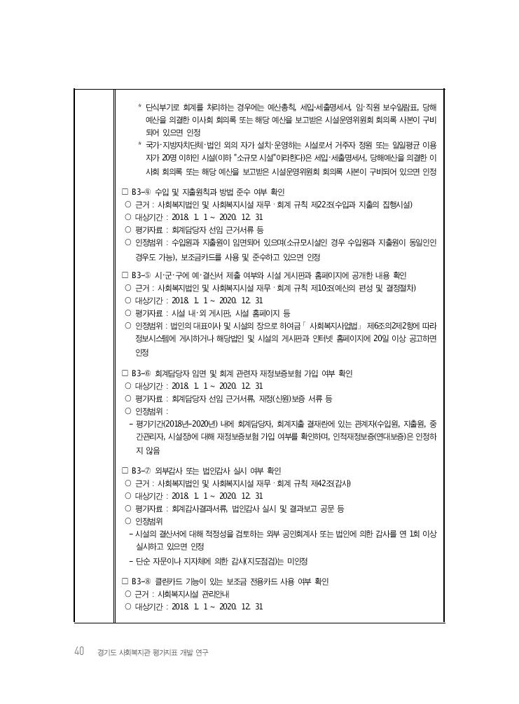 40 경기도 사회복지관 평가지표 개발 연구 * 단식부기로 회계를 처리하는 경우에는 예산총칙, 세입‧세출명세서, 임・직원 보수일람표, 당해 예산을 의결한 이사회 회의록 또는 해당 예산을 보고받은 시설운영위원회 회의록 사본이 구비 되어 있으면 인정 * 국가・지방자치단체・법인 외의 자가 설치・운영하는 시설로서 거주자 정원 또는 일일평균 이용 자가 20명 이하인 시설(이하 "소규모 시설"이라한다)은 세입・세출명세서, 당해예산을 의결한 이 사회 회의록 또는 해당 예산을 보고받은 시설운영위원회 회의록 사본이 구비되어 있으면 인정 □ B3-④ 수입 및 지출원칙과 방법 준수 여부 확인 ○ 근거 : 사회복지법인 및 사회복지시설 재무ㆍ회계 규칙 제22조(수입과 지출의 집행시설) ○ 대상기간 : 2018. 1. 1 ~ 2020. 12. 31 ○ 평가자료 : 회계담당자 선임 근거서류 등 ○ 인정범위 : 수입원과 지출원이 임면되어 있으며(소규모시설인 경우 수입원과 지출원이 동일인인 경우도 가능), 보조금카드를 사용 및 준수하고 있으면 인정 □ B3-⑤ 시・군・구에 예・결산서 제출 여부와 시설 게시판과 홈페이지에 공개한 내용 확인 ○ 근거 : 사회복지법인 및 사회복지시설 재무ㆍ회계 규칙 제10조(예산의 편성 및 결정절차) ○ 대상기간 : 2018. 1. 1 ~ 2020. 12. 31 ○ 평가자료 : 시설 내・외 게시판, 시설 홈페이지 등 ○ 인정범위 : 법인의 대표이사 및 시설의 장으로 하여금 「사회복지사업법」 제6조의2제2항에 따라 정보시스템에 게시하거나 해당법인 및 시설의 게시판과 인터넷 홈페이지에 20일 이상 공고하면 인정 □ B3-⑥ 회계담당자 임면 및 회계 관련자 재정보증보험 가입 여부 확인 ○ 대상기간 : 2018. 1. 1 ~ 2020. 12. 31 ○ 평가자료 : 회계담당자 선임 근거서류, 재정(신원)보증 서류 등 ○ 인정범위 : - 평가기간(2018년-2020년) 내에 회계담당자, 회계지출 결재란에 있는 관계자(수입원, 지출원, 중 간관리자, 시설장)에 대해 재정보증보험 가입 여부를 확인하며, 인적재정보증(연대보증)은 인정하 지 않음 □ B3-⑦ 외부감사 또는 법인감사 실시 여부 확인 ○ 근거 : 사회복지법인 및 사회복지시설 재무ㆍ회계 규칙 제42조(감사) ○ 대상기간 : 2018. 1. 1 ~ 2020. 12. 31 ○ 평가자료 : 회계감사결과서류, 법인감사 실시 및 결과보고 공문 등 ○ 인정범위 - 시설의 결산서에 대해 적정성을 검토하는 외부 공인회계사 또는 법인에 의한 감사를 연 1회 이상 실시하고 있으면 인정 - 단순 자문이나 지자체에 의한 감사(지도점검)는 미인정 □ B3-⑧ 클린카드 기능이 있는 보조금 전용카드 사용 여부 확인 ○ 근거 : 사회복지시설 관리안내 ○ 대상기간 : 2018. 1. 1 ~ 2020. 12. 31