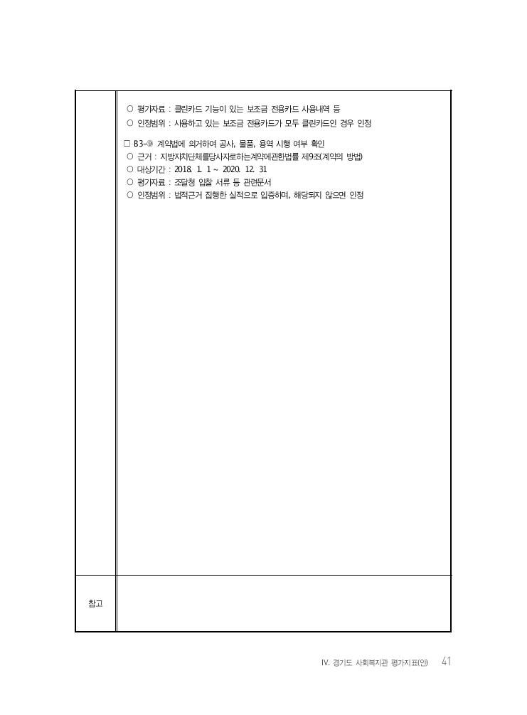 Ⅳ. 경기도 사회복지관 평가지표(안) 41 ○ 평가자료 : 클린카드 기능이 있는 보조금 전용카드 사용내역 등 ○ 인정범위 : 사용하고 있는 보조금 전용카드가 모두 클린카드인 경우 인정 □ B3-⑨ 계약법에 의거하여 공사, 물품, 용역 시행 여부 확인 ○ 근거 : 지방자치단체를당사자로하는계약에관한법률 제9조(계약의 방법) ○ 대상기간 : 2018. 1. 1 ~ 2020. 12. 31 ○ 평가자료 : 조달청 입찰 서류 등 관련문서 ○ 인정범위 : 법적근거 집행한 실적으로 입증하며, 해당되지 않으면 인정 참고