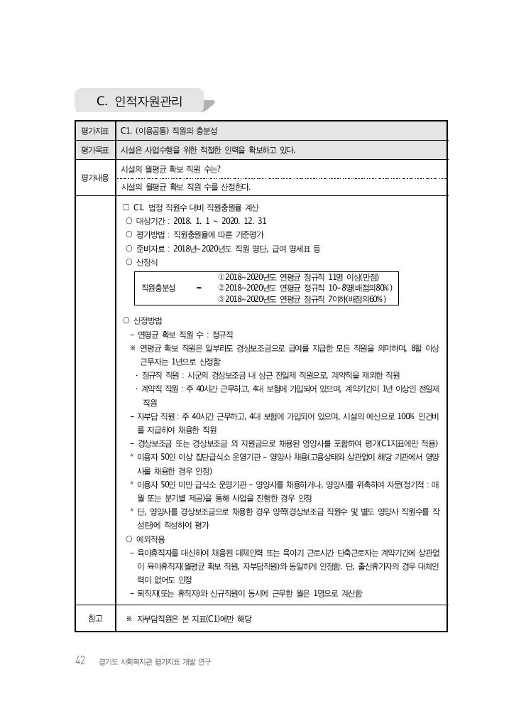 42 경기도 사회복지관 평가지표 개발 연구 평가지표 C1. (이용공통) 직원의 충분성 평가목표 시설은 사업수행을 위한 적절한 인력을 확보하고 있다. 평가내용 시설의 월평균 확보 직원 수는? 시설의 월평균 확보 직원 수를 산정한다. □ C1. 법정 직원수 대비 직원충원율 계산 ○ 대상기간 : 2018. 1. 1 ~ 2020. 12. 31 ○ 평가방법 : 직원충원율에 따른 기준평가 ○ 준비자료 : 2018년~2020년도 직원 명단, 급여 명세표 등 ○ 산정식 직원충분성 = ①2018~2020년도 연평균 정규직 11명 이상(만점) ②2018~2020년도 연평균 정규직 10~8명(배점의80%) ③2018~2020년도 연평균 정규직 7이하(배점의60%) ○ 산정방법 - 연평균 확보 직원 수 : 정규직 ※ 연평균 확보 직원은 일부라도 경상보조금으로 급여를 지급한 모든 직원을 의미하며, 8할 이상 근무자는 1년으로 산정함 · 정규직 직원 : 시군의 경상보조금 내 상근 전일제 직원으로, 계약직을 제외한 직원 · 계약직 직원 : 주 40시간 근무하고, 4대 보험에 가입되어 있으며, 계약기간이 1년 이상인 전일제 직원 - 자부담 직원 : 주 40시간 근무하고, 4대 보험에 가입되어 있으며, 시설의 예산으로 100% 인건비 를 지급하여 채용한 직원 - 경상보조금 또는 경상보조금 외 지원금으로 채용된 영양사를 포함하여 평가(C1지표에만 적용) * 이용자 50인 이상 집단급식소 운영기관 - 영양사 채용(고용상태와 상관없이 해당 기관에서 영양 사를 채용한 경우 인정) * 이용자 50인 미만 급식소 운영기관 - 영양사를 채용하거나, 영양사를 위촉하여 자문(정기적 : 매 월 또는 분기별 제공)을 통해 사업을 진행한 경우 인정 * 단, 영양사를 경상보조금으로 채용한 경우 양쪽(경상보조금 직원수 및 별도 영양사 직원수를 작 성란)에 작성하여 평가 ○ 예외적용 - 육아휴직자를 대신하여 채용된 대체인력 또는 육아기 근로시간 단축근로자는 계약기간에 상관없 이 육아휴직자(월평균 확보 직원, 자부담직원)와 동일하게 인정함. 단, 출산휴가자의 경우 대체인 력이 없어도 인정 - 퇴직자(또는 휴직자)와 신규직원이 동시에 근무한 월은 1명으로 계산함 참고 ※ 자부담직원은 본 지표(C1)에만 해당 C. 인적자원관리