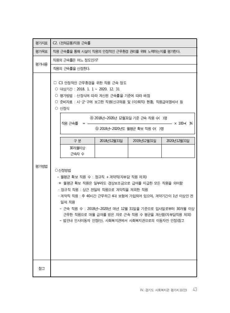 Ⅳ. 경기도 사회복지관 평가지표(안) 43 평가지표 C2. (전체공통)직원 근속률 평가목표 직원 근속률을 통해 시설이 직원의 안정적인 근무환경 관리를 위해 노력하는지를 평가한다. 평가내용 직원의 근속률은 어느 정도인가? 직원의 근속률을 산정한다. 평가방법 □ C3 안정적인 근무환경을 위한 직원 근속 정도 ○ 대상기간 : 2018. 1. 1 ~ 2020. 12. 31 ○ 평가방법 : 산정식에 따라 계산된 근속률을 기준에 따라 배점 ○ 준비자료 : 시・군・구에 보고한 직원(신규채용 및 (이)퇴직) 현황, 직원급여명세서 등 ○ 산정식 직원 근속률 = ⓐ 2018년~2020년 12월31일 기준 근속 직원 수( )명 × 100=( )% ⓑ 2018년~2020년도 월평균 확보 직원 수( )명 구 분 2018년12월31일 2019년12월31일 2020년12월31일 30개월이상 근속자 수 ○산정방법 - 월평균 확보 직원 수 : 정규직 + 계약직(자부담 직원 제외) ※ 월평균 확보 직원은 일부라도 경상보조금으로 급여를 지급한 모든 직원을 의미함 · 정규직 직원 : 상근 전일제 직원으로 계약직을 제외한 직원 · 계약직 직원 : 주 40시간 근무하고 4대 보험에 가입되어 있으며, 계약기간이 1년 이상인 전 일제 직원 - 근속 직원 수 : 2018년~2020년 매년 12월 31일을 기준으로 입사일로부터 30개월 이상 근무한 직원으로 매월 급여를 받은 자로 근속 직원 수 평균을 계산함(자부담직원 제외) - 법인내 인사이동자 인정(단, 사회복지관에서 사회복지관으로의 이동자만 인정)참고 참고