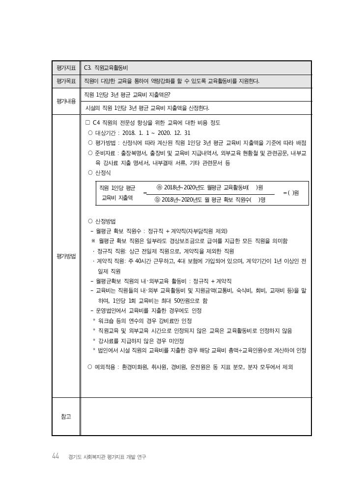 44 경기도 사회복지관 평가지표 개발 연구 평가지표 C3. 직원교육활동비 평가목표 직원이 다양한 교육을 통하여 역량강화를 할 수 있도록 교육활동비를 지원한다. 평가내용 직원 1인당 3년 평균 교육비 지출액은? 시설의 직원 1인당 3년 평균 교육비 지출액을 산정한다. 평가방법 직원 1인당 평균 교육비 지출액 = ⓐ 2018년~2020년도 월평균 교육활동비( )원 = ( )원 ⓑ 2018년~2020년도 월 평균 확보 직원수( )명 □ C4 직원의 전문성 향상을 위한 교육에 대한 비용 정도 ○ 대상기간 : 2018. 1. 1 ~ 2020. 12. 31 ○ 평가방법 : 산정식에 따라 계산된 직원 1인당 3년 평균 교육비 지출액을 기준에 따라 배점 ○ 준비자료 : 출장복명서, 출장비 및 교육비 지급내역서, 외부교육 현황철 및 관련공문, 내부교 육 강사료 지출 명세서, 내부결재 서류, 기타 관련문서 등 ○ 산정식 ○ 산정방법 - 월평균 확보 직원수 : 정규직 + 계약직(자부담직원 제외) ※ 월평균 확보 직원은 일부라도 경상보조금으로 급여를 지급한 모든 직원을 의미함 · 정규직 직원: 상근 전일제 직원으로, 계약직을 제외한 직원 · 계약직 직원: 주 40시간 근무하고, 4대 보험에 가입되어 있으며, 계약기간이 1년 이상인 전 일제 직원 - 월평균확보 직원의 내・외부교육 활동비 : 정규직 + 계약직 - 교육비는 직원들의 내・외부 교육활동비 및 지원금액(교통비, 숙식비, 회비, 교재비 등)을 말 하며, 1인당 1회 교육비는 최대 50만원으로 함 - 운영법인에서 교육비를 지출한 경우에도 인정 * 워크숍 등의 연수의 경우 강비료만 인정 * 직원교육 및 외부교육 시간으로 인정되지 않은 교육은 교육활동비로 인정하지 않음 * 강사료를 지급하지 않은 경우 미인정 * 법인에서 시설 직원의 교육비를 지출한 경우 해당 교육비 총액÷교육인원수로 계산하여 인정 ○ 예외적용 : 환경미화원, 취사원, 경비원, 운전원은 동 지표 분모, 분자 모두에서 제외 참고