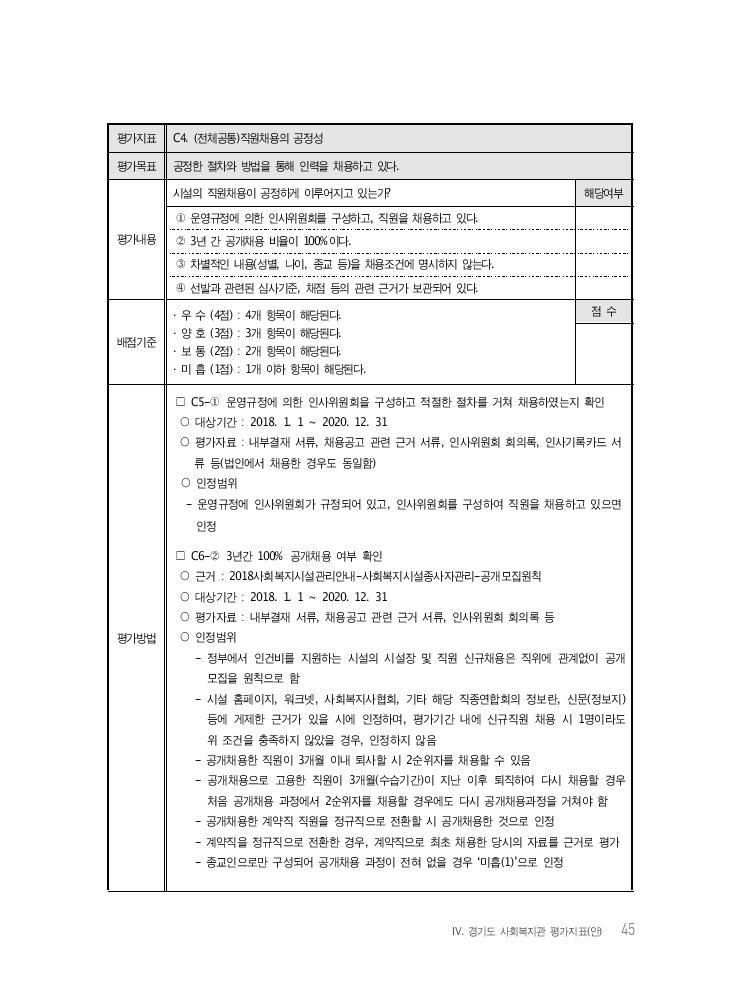 Ⅳ. 경기도 사회복지관 평가지표(안) 45 평가지표 C4. (전체공통)직원채용의 공정성 평가목표 공정한 절차와 방법을 통해 인력을 채용하고 있다. 평가내용 시설의 직원채용이 공정하게 이루어지고 있는가? 해당여부 ① 운영규정에 의한 인사위원회를 구성하고, 직원을 채용하고 있다. ② 3년 간 공개채용 비율이 100%이다. ③ 차별적인 내용(성별, 나이, 종교 등)을 채용조건에 명시하지 않는다. ④ 선발과 관련된 심사기준, 채점 등의 관련 근거가 보관되어 있다. 배점기준 · 우 수 (4점) : 4개 항목이 해당된다. · 양 호 (3점) : 3개 항목이 해당된다. · 보 통 (2점) : 2개 항목이 해당된다. · 미 흡 (1점) : 1개 이하 항목이 해당된다. 점 수 평가방법 □ C5-① 운영규정에 의한 인사위원회을 구성하고 적절한 절차를 거쳐 채용하였는지 확인 ○ 대상기간 : 2018. 1. 1 ~ 2020. 12. 31 ○ 평가자료 : 내부결재 서류, 채용공고 관련 근거 서류, 인사위원회 회의록, 인사기록카드 서 류 등(법인에서 채용한 경우도 동일함) ○ 인정범위 - 운영규정에 인사위원회가 규정되어 있고, 인사위원회를 구성하여 직원을 채용하고 있으면 인정 □ C6-② 3년간 100% 공개채용 여부 확인 ○ 근거 : 2018사회복지시설관리안내-사회복지시설종사자관리-공개모집원칙 ○ 대상기간 : 2018. 1. 1 ~ 2020. 12. 31 ○ 평가자료 : 내부결재 서류, 채용공고 관련 근거 서류, 인사위원회 회의록 등 ○ 인정범위 - 정부에서 인건비를 지원하는 시설의 시설장 및 직원 신규채용은 직위에 관계없이 공개 모집을 원칙으로 함 - 시설 홈페이지, 워크넷, 사회복지사협회, 기타 해당 직종연합회의 정보란, 신문(정보지) 등에 게제한 근거가 있을 시에 인정하며, 평가기간 내에 신규직원 채용 시 1명이라도 위 조건을 충족하지 않았을 경우, 인정하지 않음 - 공개채용한 직원이 3개월 이내 퇴사할 시 2순위자를 채용할 수 있음 - 공개채용으로 고용한 직원이 3개월(수습기간)이 지난 이후 퇴직하여 다시 채용할 경우 처음 공개채용 과정에서 2순위자를 채용할 경우에도 다시 공개채용과정을 거쳐야 함 - 공개채용한 계약직 직원을 정규직으로 전환할 시 공개채용한 것으로 인정 - 계약직을 정규직으로 전환한 경우, 계약직으로 최초 채용한 당시의 자료를 근거로 평가 - 종교인으로만 구성되어 공개채용 과정이 전혀 없을 경우 ‘미흡(1)’으로 인정