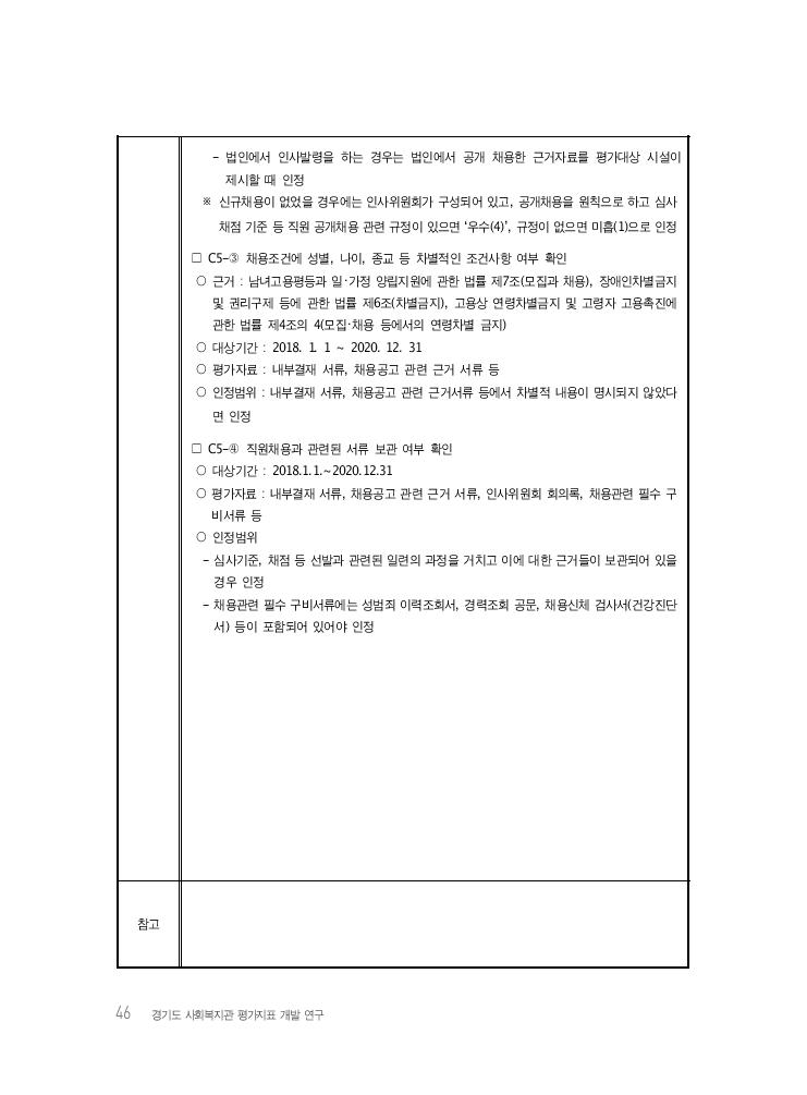 46 경기도 사회복지관 평가지표 개발 연구 - 법인에서 인사발령을 하는 경우는 법인에서 공개 채용한 근거자료를 평가대상 시설이 제시할 때 인정 ※ 신규채용이 없었을 경우에는 인사위원회가 구성되어 있고, 공개채용을 원칙으로 하고 심사 채점 기준 등 직원 공개채용 관련 규정이 있으면 ‘우수(4)’, 규정이 없으면 미흡(1)으로 인정 □ C5-③ 채용조건에 성별, 나이, 종교 등 차별적인 조건사항 여부 확인 ○ 근거 : 남녀고용평등과 일・가정 양립지원에 관한 법률 제7조(모집과 채용), 장애인차별금지 및 권리구제 등에 관한 법률 제6조(차별금지), 고용상 연령차별금지 및 고령자 고용촉진에 관한 법률 제4조의 4(모집・채용 등에서의 연령차별 금지) ○ 대상기간 : 2018. 1. 1 ~ 2020. 12. 31 ○ 평가자료 : 내부결재 서류, 채용공고 관련 근거 서류 등 ○ 인정범위 : 내부결재 서류, 채용공고 관련 근거서류 등에서 차별적 내용이 명시되지 않았다 면 인정 □ C5-④ 직원채용과 관련된 서류 보관 여부 확인 ○ 대상기간 : 2018.1.1.~2020.12.31 ○ 평가자료 : 내부결재 서류, 채용공고 관련 근거 서류, 인사위원회 회의록, 채용관련 필수 구 비서류 등 ○ 인정범위 - 심사기준, 채점 등 선발과 관련된 일련의 과정을 거치고 이에 대한 근거들이 보관되어 있을 경우 인정 - 채용관련 필수 구비서류에는 성범죄 이력조회서, 경력조회 공문, 채용신체 검사서(건강진단 서) 등이 포함되어 있어야 인정 참고