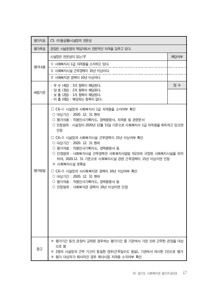 Ⅳ. 경기도 사회복지관 평가지표(안) 47 평가지표 C5. (이용공통)시설장의 전문성 평가목표 관장은 시설운영의 책임자로서 전문적인 자격을 갖추고 있다. 평가내용 시설장은 전문성이 있는가? 해당여부 ① 사회복지사 1급 자격증을 소지하고 있다. ② 사회복지시설 근무경력이 15년 이상이다. ③ 사회복지관 경력이 10년 이상이다. 배점기준 · 우 수 (4점) : 3개 항목이 해당된다. · 양 호 (3점) : 2개 항목이 해당된다. · 보 통 (2점) : 1개 항목이 해당된다. · 미 흡 (0점) : 해당되는 항목이 없다. 점 수 평가방법 □ C6-① 시설장의 사회복지사 1급 자격증을 소지여부 확인 ○ 대상기간 : 2020. 12. 31 현재 ○ 평가자료 : 직원인사기록카드, 경력증명서, 자격증 등 관련문서 ○ 인정범위 : 시설장이 2020년 12월 31일 기준으로 사회복지사 1급 자격증을 취득하고 있으면 인정 □ C6-② 시설장의 사회복지시설 근무경력이 15년 이상여부 확인 ○ 대상기간 : 2020. 12. 31 현재 ○ 평가자료 : 직원인사기록카드, 경력증명서 등 ○ 인정범위 : 사회복지시설 근무경력은 사회복지사업법 제2조에 규정된 사회복지시설을 의미 하며, 2020.12. 31 기준으로 사회복지시설 관련 근무경력이 15년 이상이면 인정 ※ 사회복지시설 분류표 □ C6-③ 시설장의 사사회복지관 경력이 10년 이상여부 확인 ○ 대상기간 : 2020. 12. 31 현재 ○ 평가자료 : 직원인사기록카드, 경력증명서 등 ○ 인정범위 : 사회복지관 경력이 10년 이상이면 인정 참고 ※ 평가기간 동안 관장이 교체된 경우에는 평가기간 중 기관에서 가장 오래 근무한 관장을 대상 으로 함 ※ 2명의 시설장의 근무 기간이 동일한 경우(근무일수도 동일), 기관에서 제시한 1인으로 평가 ※ 평가 대상자가 퇴사자인 경우 퇴사시점 자격증 소지여부 확인