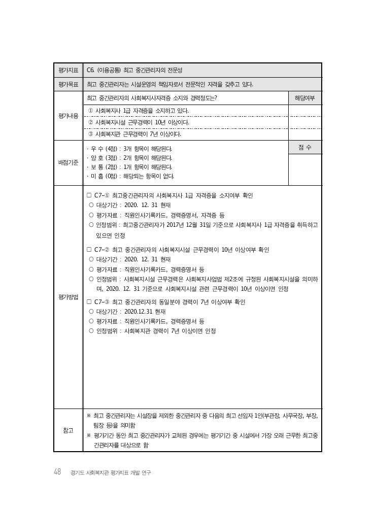 48 경기도 사회복지관 평가지표 개발 연구 평가지표 C6. (이용공통) 최고 중간관리자의 전문성 평가목표 최고 중간관리자는 시설운영의 책임자로서 전문적인 자격을 갖추고 있다. 평가내용 최고 중간관리자의 사회복지사자격증 소지와 경력정도는? 해당여부 ① 사회복지사 1급 자격증을 소지하고 있다. ② 사회복지시설 근무경력이 10년 이상이다. ③ 사회복지관 근무경력이 7년 이상이다. 배점기준 · 우 수 (4점) : 3개 항목이 해당된다. · 양 호 (3점) : 2개 항목이 해당된다. · 보 통 (2점) : 1개 항목이 해당된다. · 미 흡 (0점) : 해당되는 항목이 없다. 점 수 평가방법 □ C7-① 최고중간관리자의 사회복지사 1급 자격증을 소지여부 확인 ○ 대상기간 : 2020. 12. 31 현재 ○ 평가자료 : 직원인사기록카드, 경력증명서, 자격증 등 ○ 인정범위 : 최고중간관리자가 2017년 12월 31일 기준으로 사회복지사 1급 자격증을 취득하고 있으면 인정 □ C7-② 최고 중간관리자의 사회복지시설 근무경력이 10년 이상여부 확인 ○ 대상기간 : 2020. 12. 31 현재 ○ 평가자료 : 직원인사기록카드, 경력증명서 등 ○ 인정범위 : 사회복지시설 근무경력은 사회복지사업법 제2조에 규정된 사회복지시설을 의미하 며, 2020. 12. 31 기준으로 사회복지시설 관련 근무경력이 10년 이상이면 인정 □ C7-③ 최고 중간관리자의 동일분야 경력이 7년 이상여부 확인 ○ 대상기간 : 2020.12.31 현재 ○ 평가자료 : 직원인사기록카드, 경력증명서 등 ○ 인정범위 : 사회복지관 경력이 7년 이상이면 인정 참고 ※ 최고 중간관리자는 시설장을 제외한 중간관리자 중 다음의 최고 선임자 1인(부관장, 사무국장, 부장, 팀장 등)을 의미함 ※ 평가기간 동안 최고 중간관리자가 교체된 경우에는 평가기간 중 시설에서 가장 오래 근무한 최고중 간관리자를 대상으로 함