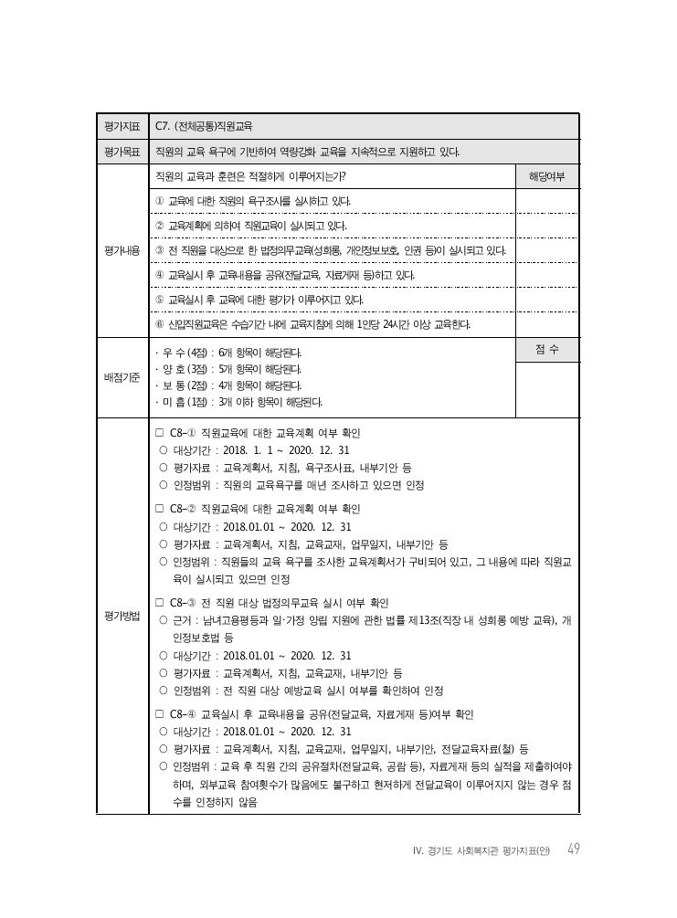 Ⅳ. 경기도 사회복지관 평가지표(안) 49 평가지표 C7. (전체공통)직원교육 평가목표 직원의 교육 욕구에 기반하여 역량강화 교육을 지속적으로 지원하고 있다. 평가내용 직원의 교육과 훈련은 적절하게 이루어지는가? 해당여부 ① 교육에 대한 직원의 욕구조사를 실시하고 있다. ② 교육계획에 의하여 직원교육이 실시되고 있다. ③ 전 직원을 대상으로 한 법정의무교육(성희롱, 개인정보보호, 인권 등)이 실시되고 있다. ④ 교육실시 후 교육내용을 공유(전달교육, 자료게재 등)하고 있다. ⑤ 교육실시 후 교육에 대한 평가가 이루어지고 있다. ⑥ 신입직원교육은 수습기간 내에 교육지침에 의해 1인당 24시간 이상 교육한다. 배점기준 · 우 수 (4점) : 6개 항목이 해당된다. · 양 호 (3점) : 5개 항목이 해당된다. · 보 통 (2점) : 4개 항목이 해당된다. · 미 흡 (1점) : 3개 이하 항목이 해당된다. 점 수 평가방법 □ C8-① 직원교육에 대한 교육계획 여부 확인 ○ 대상기간 : 2018. 1. 1 ~ 2020. 12. 31 ○ 평가자료 : 교육계획서, 지침, 욕구조사표, 내부기안 등 ○ 인정범위 : 직원의 교육욕구를 매년 조사하고 있으면 인정 □ C8-② 직원교육에 대한 교육계획 여부 확인 ○ 대상기간 : 2018.01.01 ~ 2020. 12. 31 ○ 평가자료 : 교육계획서, 지침, 교육교재, 업무일지, 내부기안 등 ○ 인정범위 : 직원들의 교육 욕구를 조사한 교육계획서가 구비되어 있고, 그 내용에 따라 직원교 육이 실시되고 있으면 인정 □ C8-③ 전 직원 대상 법정의무교육 실시 여부 확인 ○ 근거 : 남녀고용평등과 일・가정 양립 지원에 관한 법률 제13조(직장 내 성희롱 예방 교육), 개 인정보호법 등 ○ 대상기간 : 2018.01.01 ~ 2020. 12. 31 ○ 평가자료 : 교육계획서, 지침, 교육교재, 내부기안 등 ○ 인정범위 : 전 직원 대상 예방교육 실시 여부를 확인하여 인정 □ C8-④ 교육실시 후 교육내용을 공유(전달교육, 자료게재 등)여부 확인 ○ 대상기간 : 2018.01.01 ~ 2020. 12. 31 ○ 평가자료 : 교육계획서, 지침, 교육교재, 업무일지, 내부기안, 전달교육자료(철) 등 ○ 인정범위 : 교육 후 직원 간의 공유절차(전달교육, 공람 등), 자료게재 등의 실적을 제출하여야 하며, 외부교육 참여횟수가 많음에도 불구하고 현저하게 전달교육이 이루어지지 않는 경우 점 수를 인정하지 않음