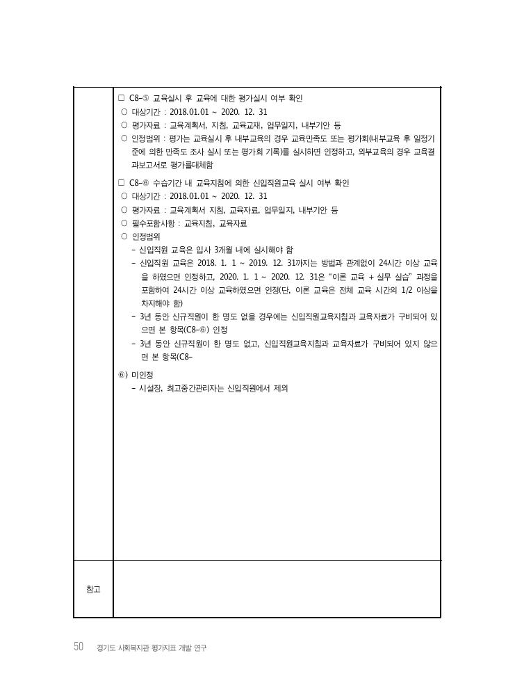 50 경기도 사회복지관 평가지표 개발 연구 □ C8-⑤ 교육실시 후 교육에 대한 평가실시 여부 확인 ○ 대상기간 : 2018.01.01 ~ 2020. 12. 31 ○ 평가자료 : 교육계획서, 지침, 교육교재, 업무일지, 내부기안 등 ○ 인정범위 : 평가는 교육실시 후 내부교육의 경우 교육만족도 또는 평가회(내부교육 후 일정기 준에 의한 만족도 조사 실시 또는 평가회 기록)를 실시하면 인정하고, 외부교육의 경우 교육결 과보고서로 평가를대체함 □ C8-⑥ 수습기간 내 교육지침에 의한 신입직원교육 실시 여부 확인 ○ 대상기간 : 2018.01.01 ~ 2020. 12. 31 ○ 평가자료 : 교육계획서 지침, 교육자료, 업무일지, 내부기안 등 ○ 필수포함사항 : 교육지침, 교육자료 ○ 인정범위 - 신입직원 교육은 입사 3개월 내에 실시해야 함 - 신입직원 교육은 2018. 1. 1 ~ 2019. 12. 31까지는 방법과 관계없이 24시간 이상 교육 을 하였으면 인정하고, 2020. 1. 1 ~ 2020. 12. 31은 “이론 교육 + 실무 실습” 과정을 포함하여 24시간 이상 교육하였으면 인정(단, 이론 교육은 전체 교육 시간의 1/2 이상을 차지해야 함) - 3년 동안 신규직원이 한 명도 없을 경우에는 신입직원교육지침과 교육자료가 구비되어 있 으면 본 항목(C8-⑥) 인정 - 3년 동안 신규직원이 한 명도 없고, 신입직원교육지침과 교육자료가 구비되어 있지 않으 면 본 항목(C8- ⑥) 미인정 - 시설장, 최고중간관리자는 신입직원에서 제외 참고