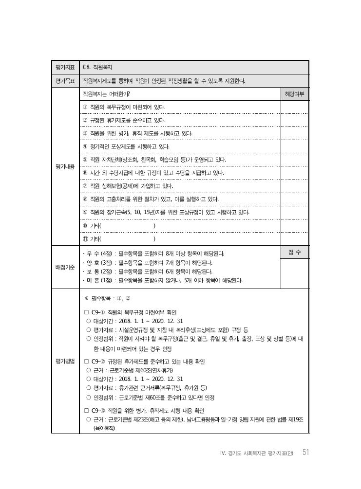 Ⅳ. 경기도 사회복지관 평가지표(안) 51 평가지표 C8. 직원복지 평가목표 직원복지제도를 통하여 직원이 안정된 직장생활을 할 수 있도록 지원한다. 평가내용 직원복지는 어떠한가? 해당여부 ① 직원의 복무규정이 마련되어 있다. ② 규정된 휴가제도를 준수하고 있다. ③ 직원을 위한 병가, 휴직 제도를 시행하고 있다. ④ 정기적인 포상제도를 시행하고 있다. ⑤ 직원 자치단체(상조회, 친목회, 학습모임 등)가 운영되고 있다. ⑥ 시간 외 수당지급에 대한 규정이 있고 수당을 지급하고 있다. ⑦ 직원 상해보험(공제)에 가입하고 있다. ⑧ 직원의 고충처리를 위한 절차가 있고, 이를 실행하고 있다. ⑨ 직원의 장기근속(5, 10, 15년)자를 위한 포상규정이 있고 시행하고 있다. ⑩ 기타( ) ⑪ 기타( ) 배점기준 · 우 수 (4점) : 필수항목을 포함하여 8개 이상 항목이 해당된다. · 양 호 (3점) : 필수항목을 포함하여 7개 항목이 해당된다. · 보 통 (2점) : 필수항목을 포함하여 6개 항목이 해당된다. · 미 흡 (1점) : 필수항목을 포함하지 않거나, 5개 이하 항목이 해당된다. 점 수 평가방법 ※ 필수항목 : ①, ② □ C9-① 직원의 복무규정 마련여부 확인 ○ 대상기간 : 2018. 1. 1 ~ 2020. 12. 31 ○ 평가자료 : 시설운영규정 및 지침 내 복리후생(포상제도 포함) 규정 등 ○ 인정범위 : 직원이 지켜야 할 복무규정(출근 및 결근, 휴일 및 휴가, 출장, 포상 및 상벌 등)에 대 한 내용이 마련되어 있는 경우 인정 □ C9-② 규정된 휴가제도를 준수하고 있는 내용 확인 ○ 근거 : 근로기준법 제60조(연차휴가) ○ 대상기간 : 2018. 1. 1 ~ 2020. 12. 31 ○ 평가자료 : 휴가관련 근거서류(복무규정, 휴가원 등) ○ 인정범위 : 근로기준법 제60조를 준수하고 있다면 인정 □ C9-③ 직원을 위한 병가, 휴직제도 시행 내용 확인 ○ 근거 : 근로기준법 제23조(해고 등의 제한), 남녀고용평등과 일・가정 양립 지원에 관한 법률 제19조 (육아휴직)