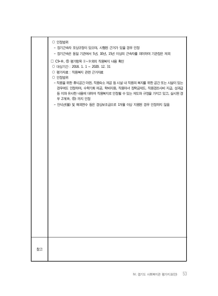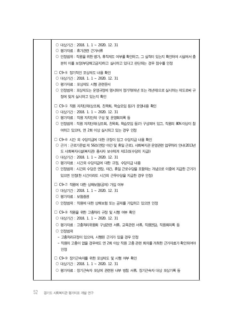 Ⅳ. 경기도 사회복지관 평가지표(안) 53 ○ 인정범위 - 장기근속자 포상규정이 있으며, 시행된 근거가 있을 경우 인정 - 장기근속은 동일 기관에서 5년, 10년, 15년 이상의 근속자를 의미하며 기관장은 제외 □ C9-⑩, ⑪ 평가항목 ①~⑨외의 직원복지 내용 확인 ○ 대상기간 : 2018. 1. 1 ~ 2020. 12. 31 ○ 평가자료 : 직원복지 관련 근거자료 ○ 인정범위 - 직원을 위한 휴식공간 마련, 직원숙소 제공 등 시설 내 직원의 복지를 위한 공간 또는 시설이 있는 경우에도 인정하며, 수학기회 제공, 학비지원, 직원자녀 장학금제도, 직원경조사비 지급, 성과급 등 이와 유사한 내용에 대하여 직원복지로 인정될 수 있는 제도와 규정을 가지고 있고, 실시된 경 우 2개(⑩, ⑪) 까지 인정 - 안식년(월) 및 해외연수 등은 경상보조금으로 1개월 이상 지원된 경우 인정하지 않음 참고