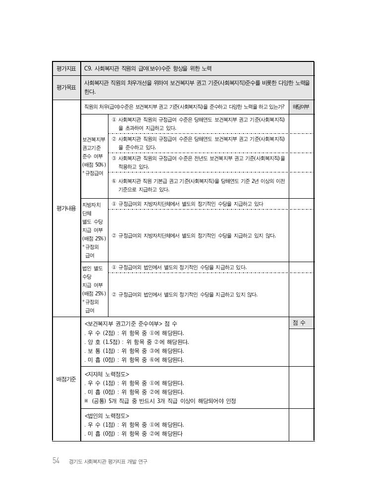 54 경기도 사회복지관 평가지표 개발 연구 평가지표 C9. 사회복지관 직원의 급여(보수)수준 향상을 위한 노력 평가목표 사회복지관 직원의 처우개선을 위하여 보건복지부 권고 기준(사회복지직)준수를 비롯한 다양한 노력을 한다. 평가내용 직원의 처우(급여)수준은 보건복지부 권고 기준(사회복지직)을 준수하고 다양한 노력을 하고 있는가? 해당여부 보건복지부 권고기준 준수 여부 (배점 50%) *규정급여 ① 사회복지관 직원의 규정급여 수준은 당해연도 보건복지부 권고 기준(사회복지직) 을 초과하여 지급하고 있다. ② 사회복지관 직원의 규정급여 수준은 당해연도 보건복지부 권고 기준(사회복지직) 을 준수하고 있다. ③ 사회복지관 직원의 규정급여 수준은 전년도 보건복지부 권고 기준(사회복지직)을 적용하고 있다. ④ 사회복지관 직원 기본급 권고 기준(사회복지직)을 당해연도 기준 2년 이상의 이전 기준으로 지급하고 있다. 지방자치 단체 별도 수당 지급 여부 (배점 25%) *규정외 급여 ① 규정급여외 지방자치단체에서 별도의 정기적인 수당을 지급하고 있다 ② 규정급여외 지방자치단체에서 별도의 정기적인 수당을 지급하고 있지 않다. 법인 별도 수당 지급 여부 (배점 25%) *규정외 급여 ① 규정급여외 법인에서 별도의 정기적인 수당을 지급하고 있다. ② 규정급여외 법인에서 별도의 정기적인 수당을 지급하고 있지 않다. 배점기준 <보건복지부 권고기준 준수여부> 점 수 ․ 우 수 (2점) : 위 항목 중 ①에 해당된다. ․ 양 호 (1.5점) : 위 항목 중 ②에 해당된다. ․ 보 통 (1점) : 위 항목 중 ③에 해당된다. ․ 미 흡 (0점) : 위 항목 중 ④에 해당된다. 점 수 <지자체 노력정도> ․ 우 수 (1점) : 위 항목 중 ①에 해당된다. ․ 미 흡 (0점) : 위 항목 중 ②에 해당된다. ※ (공통) 5개 직급 중 반드시 3개 직급 이상이 해당되어야 인정 <법인의 노력정도> ․ 우 수 (1점) : 위 항목 중 ①에 해당된다. ․ 미 흡 (0점) : 위 항목 중 ②에 해당된다
