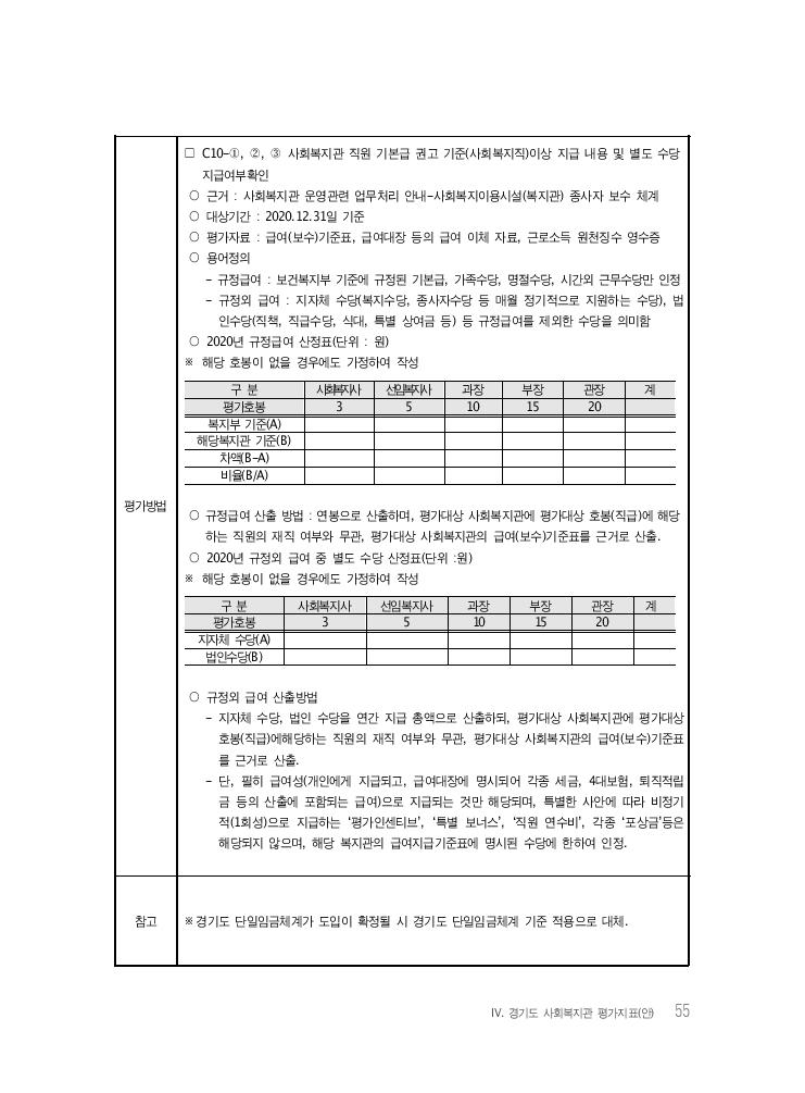Ⅳ. 경기도 사회복지관 평가지표(안) 55 평가방법 □ C10-①, ②, ③ 사회복지관 직원 기본급 권고 기준(사회복지직)이상 지급 내용 및 별도 수당 지급여부확인 ○ 근거 : 사회복지관 운영관련 업무처리 안내-사회복지이용시설(복지관) 종사자 보수 체계 ○ 대상기간 : 2020.12.31일 기준 ○ 평가자료 : 급여(보수)기준표, 급여대장 등의 급여 이체 자료, 근로소득 원천징수 영수증 ○ 용어정의 - 규정급여 : 보건복지부 기준에 규정된 기본급, 가족수당, 명절수당, 시간외 근무수당만 인정 - 규정외 급여 : 지자체 수당(복지수당, 종사자수당 등 매월 정기적으로 지원하는 수당), 법 인수당(직책, 직급수당, 식대, 특별 상여금 등) 등 규정급여를 제외한 수당을 의미함 ○ 2020년 규정급여 산정표(단위 : 원) ※ 해당 호봉이 없을 경우에도 가정하여 작성 구 분 사회복지사 선임복지사 과장 부장 관장 계 평가호봉 3 5 10 15 20 복지부 기준(A) 해당복지관 기준(B) 차액(B-A) 비율(B/A) ○ 규정급여 산출 방법 : 연봉으로 산출하며, 평가대상 사회복지관에 평가대상 호봉(직급)에 해당 하는 직원의 재직 여부와 무관, 평가대상 사회복지관의 급여(보수)기준표를 근거로 산출. ○ 2020년 규정외 급여 중 별도 수당 산정표(단위 :원) ※ 해당 호봉이 없을 경우에도 가정하여 작성 구 분 사회복지사 선임복지사 과장 부장 관장 계 평가호봉 3 5 10 15 20 지자체 수당(A) 법인수당(B) ○ 규정외 급여 산출방법 - 지자체 수당, 법인 수당을 연간 지급 총액으로 산출하되, 평가대상 사회복지관에 평가대상 호봉(직급)에해당하는 직원의 재직 여부와 무관, 평가대상 사회복지관의 급여(보수)기준표 를 근거로 산출. - 단, 필히 급여성(개인에게 지급되고, 급여대장에 명시되어 각종 세금, 4대보험, 퇴직적립 금 등의 산출에 포함되는 급여)으로 지급되는 것만 해당되며, 특별한 사안에 따라 비정기 적(1회성)으로 지급하는 ‘평가인센티브’, ‘특별 보너스’, ‘직원 연수비’, 각종 ‘포상금’등은 해당되지 않으며, 해당 복지관의 급여지급기준표에 명시된 수당에 한하여 인정. 참고 ※경기도 단일임금체계가 도입이 확정될 시 경기도 단일임금체계 기준 적용으로 대체.