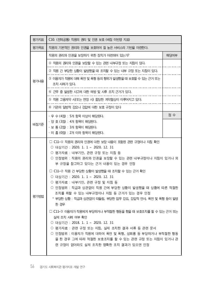 56 경기도 사회복지관 평가지표 개발 연구 평가지표 C10. (전체공통) 직원의 권리 및 인권 보호 (배점 미반영 지표) 평가목표 직원의 기본적인 권리와 인권을 보호하여 질 높은 서비스의 기반을 마련한다. 평가내용 직원의 권리와 인권을 보장하기 위한 장치가 마련되어 있는가? 해당여부 ① 직원의 권리와 인권을 보장할 수 있는 관련 내부규정 또는 지침이 있다. ② 직원 간 부당한 상황이 발생했을 때 조치할 수 있는 내부 규정 또는 지침이 있다. ③ 이용자가 직원에 대해 폭언 및 폭행 등의 행위가 발생했을 때 보호할 수 있는 근거 또는 조치 사례가 있다. ④ 근무 중 발생한 사고에 대한 예방 및 사후 조치 근거가 있다. ⑤ 직원 고용계약 시(또는 연장 시) 합당한 계약협상이 이루어지고 있다. ⑥ 기관의 일방적 강요나 강압에 대한 보호 규정이 있다 배점기준 · 우 수 (4점) : 5개 항목 이상이 해당된다. · 양 호 (3점) : 4개 항목이 해당된다. · 보 통 (2점) : 3개 항목이 해당된다. · 미 흡 (0점) : 2개 이하 항목이 해당된다. 점 수 평가방법 □ C11-① 직원의 권리와 인권에 대한 보장 내용이 포함된 관련 규정이나 지침 확인 ○ 대상기간 : 2020. 1. 1 ~ 2020. 12. 31 ○ 평가자료 : 내부기안, 관련 규정 또는 지침 등 ○ 인정범위 : 직원의 권리와 인권을 보장할 수 있는 관련 내부규정이나 지침이 있거나 외 부 규정을 참고하고 있다는 근거 내용이 있는 경우 인정 □ C11-② 직원 간 부당한 상황이 발생했을 때 조치할 수 있는 근거 확인 ○ 대상기간 : 2020. 1. 1 ~ 2020. 12. 31 ○ 평가자료 : 내부기안, 관련 규정 및 지침 등 ○ 인정범위 : 직급과 상관없이 직원 간에 부당한 상황이 발생했을 때 상황에 따른 적절한 조치를 취할 수 있는 내부규정이나 지침 등 근거가 있는 경우 인정 * 부당한 상황 : 직급과 상관없이 따돌림, 부당한 업무 강요, 강압적 언사, 폭언 및 폭행 등이 발생 한 경우 □ C11-③ 이용자가 직원에게 부당하거나 부적절한 행동을 했을 때 보호조치를 할 수 있는 근거 또는 실제 조치 사례 여부 확인 ○ 대상기간 : 2018. 1. 1 ~ 2020. 12. 31 ○ 평가자료 : 관련 규정 또는 지침, 실제 조치한 결과 서류 등 관련 문서 ○ 인정범위 : 이용자가 직원에 대하여 폭언 및 폭행, 성희롱 등 부당하거나 부적절한 행동 을 한 경우 그에 따라 적절한 보호조치를 할 수 있는 관련 규정 또는 지침이 있거나 관 련 규정이 없더라도 실제 조치한 명확한 조치 결과가 있으면 인정