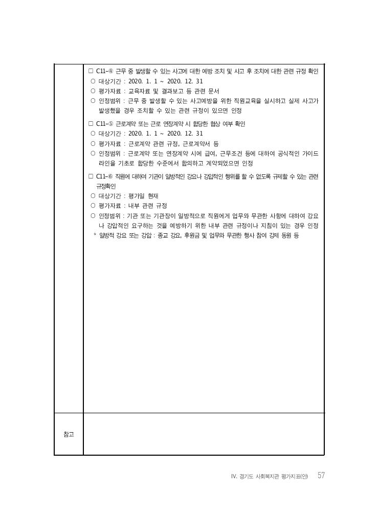 Ⅳ. 경기도 사회복지관 평가지표(안) 57 □ C11-④ 근무 중 발생할 수 있는 사고에 대한 예방 조치 및 사고 후 조치에 대한 관련 규정 확인 ○ 대상기간 : 2020. 1. 1 ~ 2020. 12. 31 ○ 평가자료 : 교육자료 및 결과보고 등 관련 문서 ○ 인정범위 : 근무 중 발생할 수 있는 사고예방을 위한 직원교육을 실시하고 실제 사고가 발생했을 경우 조치할 수 있는 관련 규정이 있으면 인정 □ C11-⑤ 근로계약 또는 근로 연장계약 시 합당한 협상 여부 확인 ○ 대상기간 : 2020. 1. 1 ~ 2020. 12. 31 ○ 평가자료 : 근로계약 관련 규정, 근로계약서 등 ○ 인정범위 : 근로계약 또는 연장계약 시에 급여, 근무조건 등에 대하여 공식적인 가이드 라인을 기초로 합당한 수준에서 합의하고 계약되었으면 인정 □ C11-⑥ 직원에 대하여 기관이 일방적인 강요나 강압적인 행위를 할 수 없도록 규제할 수 있는 관련 규정확인 ○ 대상기간 : 평가일 현재 ○ 평가자료 : 내부 관련 규정 ○ 인정범위 : 기관 또는 기관장이 일방적으로 직원에게 업무와 무관한 사항에 대하여 강요 나 강압적인 요구하는 것을 예방하기 위한 내부 관련 규정이나 지침이 있는 경우 인정 * 일방적 강요 또는 강압 : 종교 강요, 후원금 및 업무와 무관한 행사 참여 강제 동원 등 참고