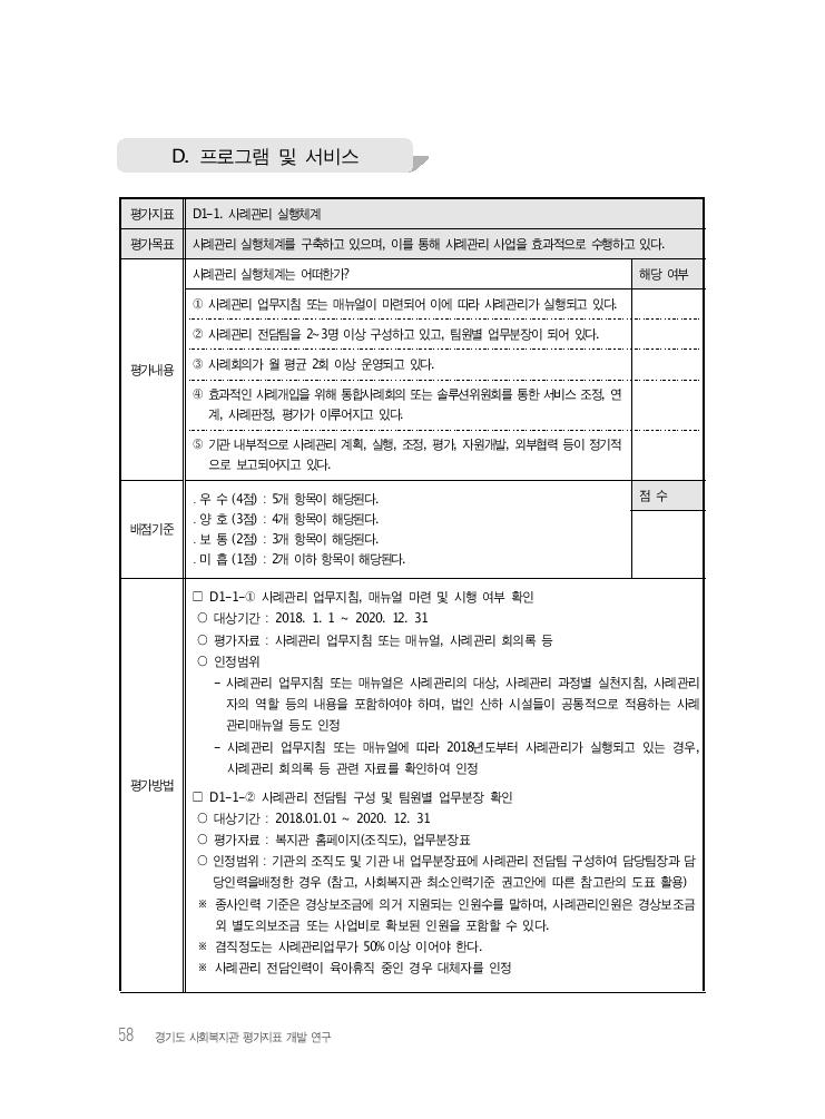 58 경기도 사회복지관 평가지표 개발 연구 평가지표 D1-1. 사례관리 실행체계 평가목표 사례관리 실행체계를 구축하고 있으며, 이를 통해 사례관리 사업을 효과적으로 수행하고 있다. 평가내용 사례관리 실행체계는 어떠한가? 해당 여부 ① 사례관리 업무지침 또는 매뉴얼이 마련되어 이에 따라 사례관리가 실행되고 있다. ② 사례관리 전담팀을 2~3명 이상 구성하고 있고, 팀원별 업무분장이 되어 있다. ③ 사례회의가 월 평균 2회 이상 운영되고 있다. ④ 효과적인 사례개입을 위해 통합사례회의 또는 솔루션위원회를 통한 서비스 조정, 연 계, 사례판정, 평가가 이루어지고 있다. ⑤ 기관 내부적으로 사례관리 계획, 실행, 조정, 평가, 자원개발, 외부협력 등이 정기적 으로 보고되어지고 있다. 배점기준 ․ 우 수 (4점) : 5개 항목이 해당된다. ․ 양 호 (3점) : 4개 항목이 해당된다. ․ 보 통 (2점) : 3개 항목이 해당된다. ․ 미 흡 (1점) : 2개 이하 항목이 해당된다. 점 수 평가방법 □ D1-1-① 사례관리 업무지침, 매뉴얼 마련 및 시행 여부 확인 ○ 대상기간 : 2018. 1. 1 ~ 2020. 12. 31 ○ 평가자료 : 사례관리 업무지침 또는 매뉴얼, 사례관리 회의록 등 ○ 인정범위 - 사례관리 업무지침 또는 매뉴얼은 사례관리의 대상, 사례관리 과정별 실천지침, 사례관리 자의 역할 등의 내용을 포함하여야 하며, 법인 산하 시설들이 공통적으로 적용하는 사례 관리매뉴얼 등도 인정 - 사례관리 업무지침 또는 매뉴얼에 따라 2018년도부터 사례관리가 실행되고 있는 경우, 사례관리 회의록 등 관련 자료를 확인하여 인정 □ D1-1-② 사례관리 전담팀 구성 및 팀원별 업무분장 확인 ○ 대상기간 : 2018.01.01 ~ 2020. 12. 31 ○ 평가자료 : 복지관 홈페이지(조직도), 업무분장표 ○ 인정범위 : 기관의 조직도 및 기관 내 업무분장표에 사례관리 전담팀 구성하여 담당팀장과 담 당인력을배정한 경우 (참고, 사회복지관 최소인력기준 권고안에 따른 참고란의 도표 활용) ※ 종사인력 기준은 경상보조금에 의거 지원되는 인원수를 말하며, 사례관리인원은 경상보조금 외 별도의보조금 또는 사업비로 확보된 인원을 포함할 수 있다. ※ 겸직정도는 사례관리업무가 50%이상 이어야 한다. ※ 사례관리 전담인력이 육아휴직 중인 경우 대체자를 인정 D. 프로그램 및 서비스