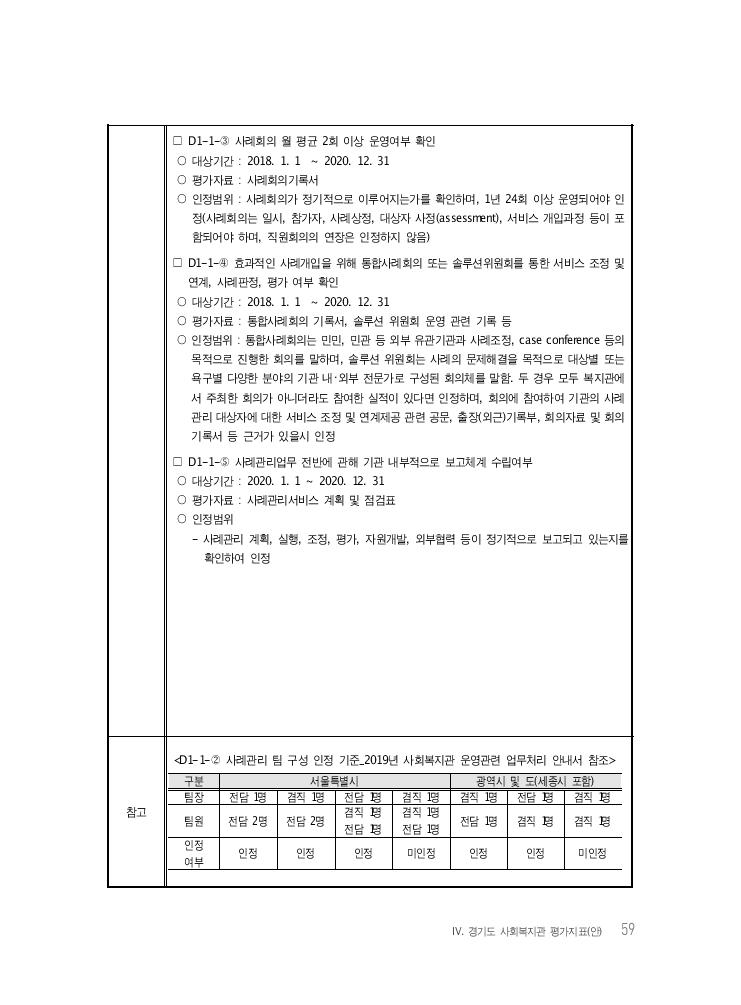 Ⅳ. 경기도 사회복지관 평가지표(안) 59 □ D1-1-③ 사례회의 월 평균 2회 이상 운영여부 확인 ○ 대상기간 : 2018. 1. 1 ~ 2020. 12. 31 ○ 평가자료 : 사례회의기록서 ○ 인정범위 : 사례회의가 정기적으로 이루어지는가를 확인하며, 1년 24회 이상 운영되어야 인 정(사례회의는 일시, 참가자, 사례상정, 대상자 사정(assessment), 서비스 개입과정 등이 포 함되어야 하며, 직원회의의 연장은 인정하지 않음) □ D1-1-④ 효과적인 사례개입을 위해 통합사례회의 또는 솔루션위원회를 통한 서비스 조정 및 연계, 사례판정, 평가 여부 확인 ○ 대상기간 : 2018. 1. 1 ~ 2020. 12. 31 ○ 평가자료 : 통합사례회의 기록서, 솔루션 위원회 운영 관련 기록 등 ○ 인정범위 : 통합사례회의는 민민, 민관 등 외부 유관기관과 사례조정, case conference 등의 목적으로 진행한 회의를 말하며, 솔루션 위원회는 사례의 문제해결을 목적으로 대상별 또는 욕구별 다양한 분야의 기관 내・외부 전문가로 구성된 회의체를 말함. 두 경우 모두 복지관에 서 주최한 회의가 아니더라도 참여한 실적이 있다면 인정하며, 회의에 참여하여 기관의 사례 관리 대상자에 대한 서비스 조정 및 연계제공 관련 공문, 출장(외근)기록부, 회의자료 및 회의 기록서 등 근거가 있을시 인정 □ D1-1-⑤ 사례관리업무 전반에 관해 기관 내부적으로 보고체계 수립여부 ○ 대상기간 : 2020. 1. 1 ~ 2020. 12. 31 ○ 평가자료 : 사례관리서비스 계획 및 점검표 ○ 인정범위 - 사례관리 계획, 실행, 조정, 평가, 자원개발, 외부협력 등이 정기적으로 보고되고 있는지를 확인하여 인정 참고 <D1-1-② 사례관리 팀 구성 인정 기준_2019년 사회복지관 운영관련 업무처리 안내서 참조> 구분 서울특별시 광역시 및 도(세종시 포함) 팀장 전담 1명 겸직 1명 전담 1명 겸직 1명 겸직 1명 전담 1명 겸직 1명 팀원 전담 2명 전담 2명 겸직 1명전담 1명 겸직 1명 전담 1명 전담 1명 겸직 1명 겸직 1명 인정 여부 인정 인정 인정 미인정 인정 인정 미인정