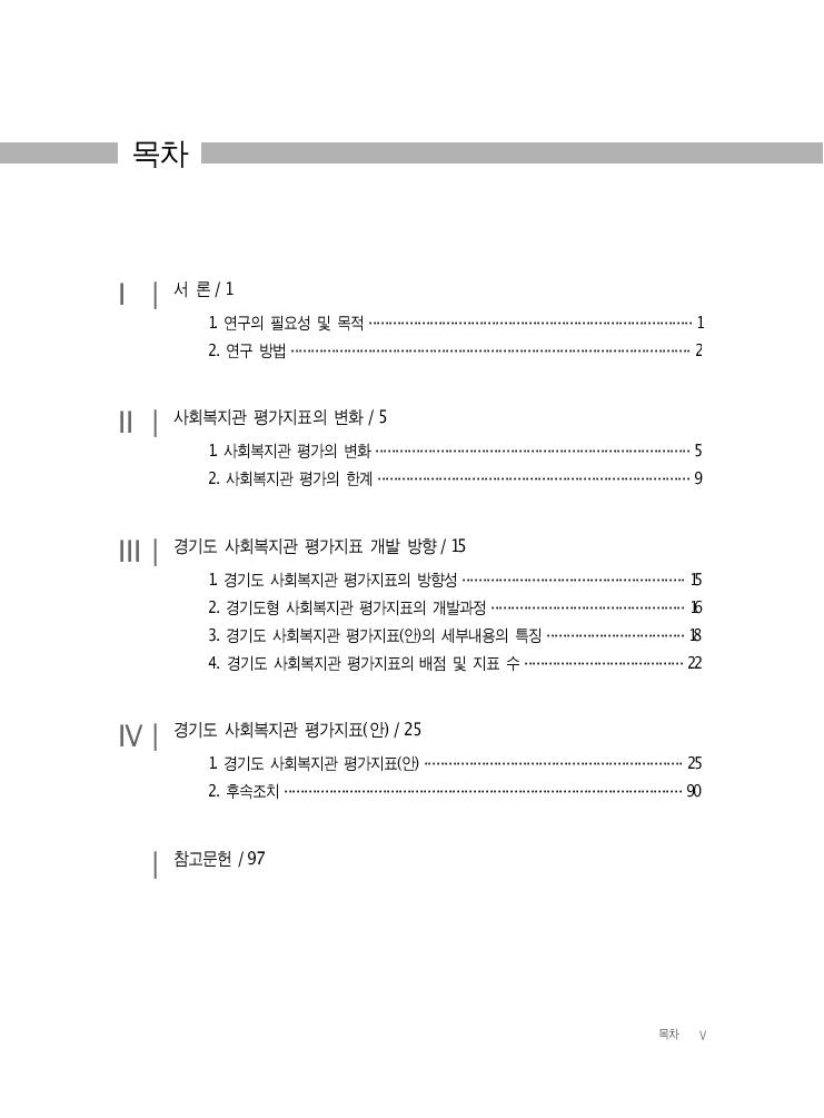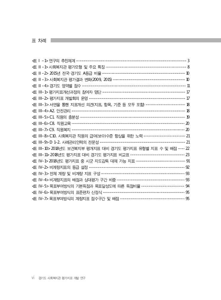 목차 v 목차 Ⅰ| 서 론/ 1 1. 연구의 필요성 및 목적 ··············································································· 1 2. 연구 방법 ·································································································· 2 Ⅱ| 사회복지관 평가지표의 변화/5 1. 사회복지관 평가의 변화 ············································································· 5 2. 사회복지관 평가의 한계 ············································································ 9 Ⅲ| 경기도 사회복지관 평가지표 개발 방향/ 15 1. 경기도 사회복지관 평가지표의 방향성 ······················································ 15 2. 경기도형 사회복지관 평가지표의 개발과정 ··············································· 16 3. 경기도 사회복지관 평가지표(안)의 세부내용의 특징 ·································· 18 4. 경기도 사회복지관 평가지표의 배점 및 지표 수 ······································· 22 Ⅳ| 경기도 사회복지관 평가지표(안) / 25 1. 경기도 사회복지관 평가지표(안) ······························································· 25 2. 후속조치 ································································································· 90 | 참고문헌/97