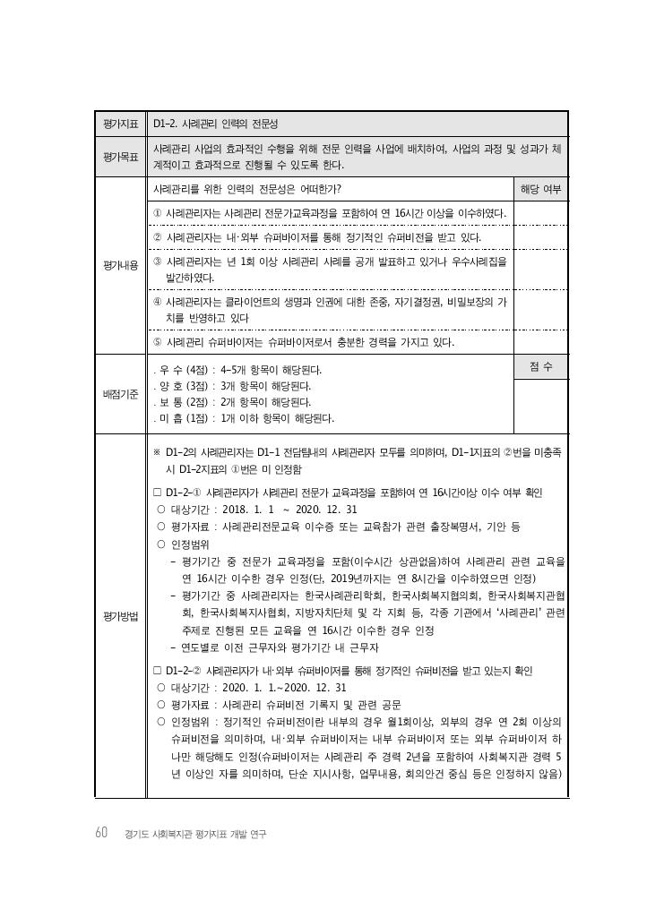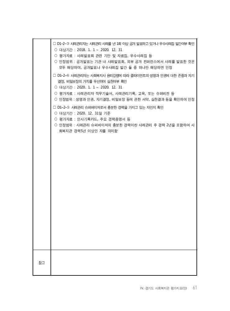 Ⅳ. 경기도 사회복지관 평가지표(안) 61 □ D1-2-③ 사례관리자는 사례관리 사례를 년 1회 이상 공개 발표하고 있거나 우수사례집 발간여부 확인 ○ 대상기간 : 2018. 1. 1 ~ 2020. 12. 31 ○ 평가자료 : 사례발표회 관련 기안 및 자료집, 우수사례집 등 ○ 인정범위 : 공개발표는 기관 내 사례발표회, 외부 공개 컨퍼런스에서 사례를 발표한 것은 모두 해당하며, 공개발표나 우수사례집 발간 둘 중 하나만 해당하면 인정 □ D1-2-④ 사례관리자는 사회복지사 윤리강령에 따라 클라이언트의 생명과 인권에 대한 존중과 자기 결정, 비밀보장의 가치를 우선하여 실천여부 확인 ○ 대상기간 : 2020. 1. 1 ~ 2020. 12. 31 ○ 평가자료 : 사례관리자 직무기술서, 사례관리기록, 교육, 또는 슈퍼비전 등 ○ 인정범위 : 생명과 인권, 자기결정, 비밀보장 등에 관한 서약, 실천결과 등을 확인하여 인정 □ D1-2-⑤ 사례관리 슈퍼바이저로서 충분한 경력을 가지고 있는 자인지 확인 ○ 대상기간 : 2020. 12. 31일 기준 ○ 평가자료 : 인사기록카드, 주요 경력증명서 등 ○ 인정범위 : 사례관리 슈퍼바이저의 충분한 경력이란 사례관리 주 경력 2년을 포함하여 사 회복지관 경력5년 이상인 자를 의미함 참고