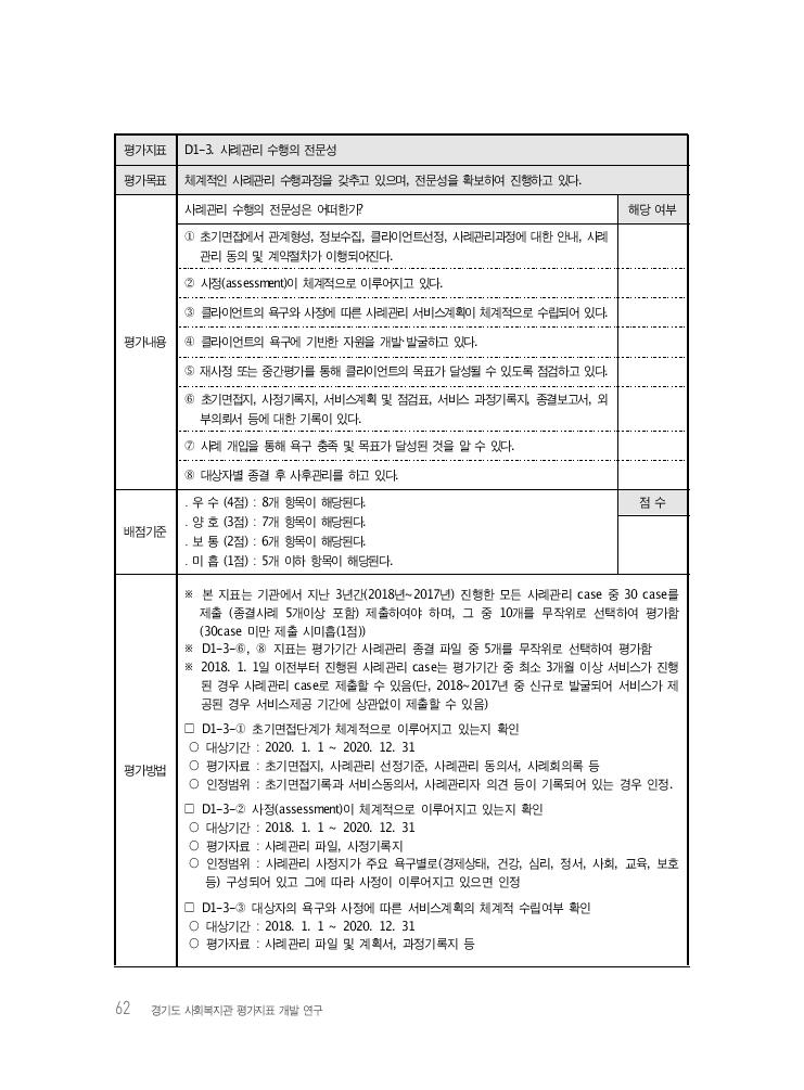 62 경기도 사회복지관 평가지표 개발 연구 평가지표 D1-3. 사례관리 수행의 전문성 평가목표 체계적인 사례관리 수행과정을 갖추고 있으며, 전문성을 확보하여 진행하고 있다. 평가내용 사례관리 수행의 전문성은 어떠한가? 해당 여부 ① 초기면접에서 관계형성, 정보수집, 클라이언트선정, 사례관리과정에 대한 안내, 사례 관리 동의 및 계약절차가 이행되어진다. ② 사정(assessment)이 체계적으로 이루어지고 있다. ③ 클라이언트의 욕구와 사정에 따른 사례관리 서비스계획이 체계적으로 수립되어 있다. ④ 클라이언트의 욕구에 기반한 자원을 개발・발굴하고 있다. ⑤ 재사정 또는 중간평가를 통해 클라이언트의 목표가 달성될 수 있도록 점검하고 있다. ⑥ 초기면접지, 사정기록지, 서비스계획 및 점검표, 서비스 과정기록지, 종결보고서, 외 부의뢰서 등에 대한 기록이 있다. ⑦ 사례 개입을 통해 욕구 충족 및 목표가 달성된 것을 알 수 있다. ⑧ 대상자별 종결 후 사후관리를 하고 있다. 배점기준 ․ 우 수 (4점) : 8개 항목이 해당된다. ․ 양 호 (3점) : 7개 항목이 해당된다. ․ 보 통 (2점) : 6개 항목이 해당된다. ․ 미 흡 (1점) : 5개 이하 항목이 해당된다. 점 수 평가방법 ※ 본 지표는 기관에서 지난 3년간(2018년~2017년) 진행한 모든 사례관리 case 중 30 case를 제출 (종결사례 5개이상 포함) 제출하여야 하며, 그 중 10개를 무작위로 선택하여 평가함 (30case 미만 제출 시미흡(1점)) ※ D1-3-⑥, ⑧ 지표는 평가기간 사례관리 종결 파일 중 5개를 무작위로 선택하여 평가함 ※ 2018. 1. 1일 이전부터 진행된 사례관리 case는 평가기간 중 최소 3개월 이상 서비스가 진행 된 경우 사례관리 case로 제출할 수 있음(단, 2018~2017년 중 신규로 발굴되어 서비스가 제 공된 경우 서비스제공 기간에 상관없이 제출할 수 있음) □ D1-3-① 초기면접단계가 체계적으로 이루어지고 있는지 확인 ○ 대상기간 : 2020. 1. 1 ~ 2020. 12. 31 ○ 평가자료 : 초기면접지, 사례관리 선정기준, 사례관리 동의서, 사례회의록 등 ○ 인정범위 : 초기면접기록과 서비스동의서, 사례관리자 의견 등이 기록되어 있는 경우 인정. □ D1-3-② 사정(assessment)이 체계적으로 이루어지고 있는지 확인 ○ 대상기간 : 2018. 1. 1 ~ 2020. 12. 31 ○ 평가자료 : 사례관리 파일, 사정기록지 ○ 인정범위 : 사례관리 사정지가 주요 욕구별로(경제상태, 건강, 심리, 정서, 사회, 교육, 보호 등) 구성되어 있고 그에 따라 사정이 이루어지고 있으면 인정 □ D1-3-③ 대상자의 욕구와 사정에 따른 서비스계획의 체계적 수립여부 확인 ○ 대상기간 : 2018. 1. 1 ~ 2020. 12. 31 ○ 평가자료 : 사례관리 파일 및 계획서, 과정기록지 등