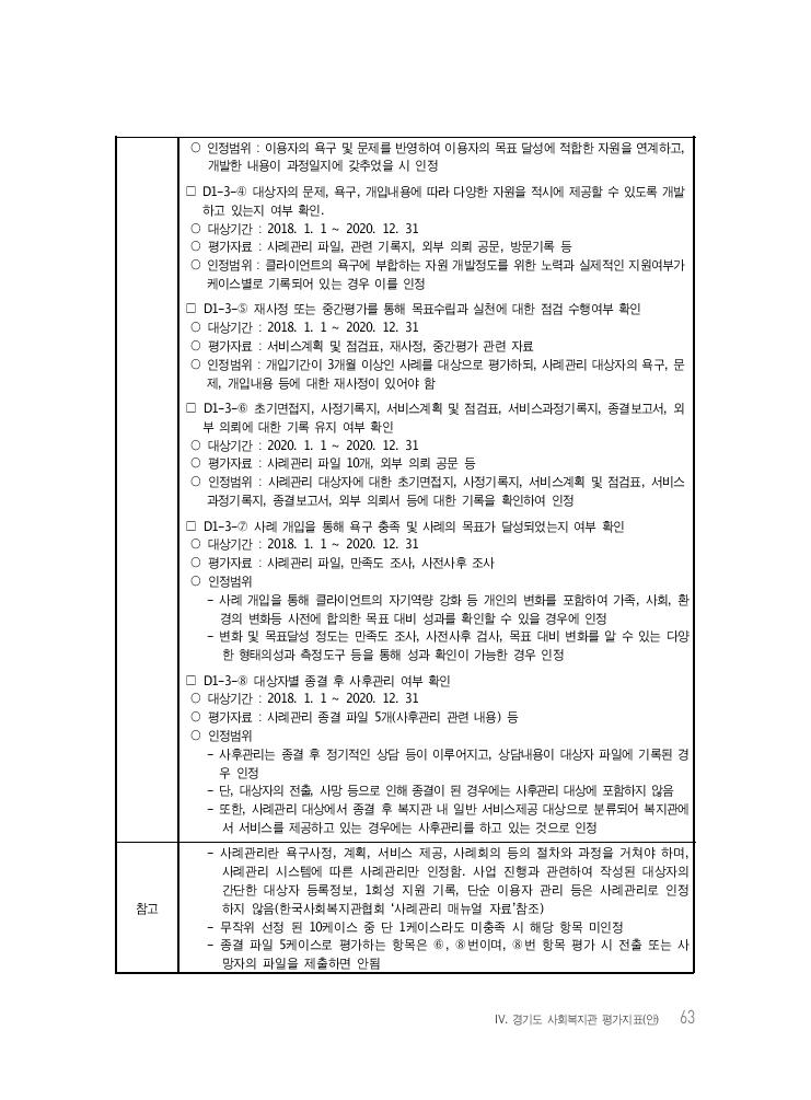 Ⅳ. 경기도 사회복지관 평가지표(안) 63 ○ 인정범위 : 이용자의 욕구 및 문제를 반영하여 이용자의 목표 달성에 적합한 자원을 연계하고, 개발한 내용이 과정일지에 갖추었을 시 인정 □ D1-3-④ 대상자의 문제, 욕구, 개입내용에 따라 다양한 자원을 적시에 제공할 수 있도록 개발 하고 있는지 여부 확인. ○ 대상기간 : 2018. 1. 1 ~ 2020. 12. 31 ○ 평가자료 : 사례관리 파일, 관련 기록지, 외부 의뢰 공문, 방문기록 등 ○ 인정범위 : 클라이언트의 욕구에 부합하는 자원 개발정도를 위한 노력과 실제적인 지원여부가 케이스별로 기록되어 있는 경우 이를 인정 □ D1-3-⑤ 재사정 또는 중간평가를 통해 목표수립과 실천에 대한 점검 수행여부 확인 ○ 대상기간 : 2018. 1. 1 ~ 2020. 12. 31 ○ 평가자료 : 서비스계획 및 점검표, 재사정, 중간평가 관련 자료 ○ 인정범위 : 개입기간이 3개월 이상인 사례를 대상으로 평가하되, 사례관리 대상자의 욕구, 문 제, 개입내용 등에 대한 재사정이 있어야 함 □ D1-3-⑥ 초기면접지, 사정기록지, 서비스계획 및 점검표, 서비스과정기록지, 종결보고서, 외 부 의뢰에 대한 기록 유지 여부 확인 ○ 대상기간 : 2020. 1. 1 ~ 2020. 12. 31 ○ 평가자료 : 사례관리 파일 10개, 외부 의뢰 공문 등 ○ 인정범위 : 사례관리 대상자에 대한 초기면접지, 사정기록지, 서비스계획 및 점검표, 서비스 과정기록지, 종결보고서, 외부 의뢰서 등에 대한 기록을 확인하여 인정 □ D1-3-⑦ 사례 개입을 통해 욕구 충족 및 사례의 목표가 달성되었는지 여부 확인 ○ 대상기간 : 2018. 1. 1 ~ 2020. 12. 31 ○ 평가자료 : 사례관리 파일, 만족도 조사, 사전사후 조사 ○ 인정범위 - 사례 개입을 통해 클라이언트의 자기역량 강화 등 개인의 변화를 포함하여 가족, 사회, 환 경의 변화등 사전에 합의한 목표 대비 성과를 확인할 수 있을 경우에 인정 - 변화 및 목표달성 정도는 만족도 조사, 사전사후 검사, 목표 대비 변화를 알 수 있는 다양 한 형태의성과 측정도구 등을 통해 성과 확인이 가능한 경우 인정 □ D1-3-⑧ 대상자별 종결 후 사후관리 여부 확인 ○ 대상기간 : 2018. 1. 1 ~ 2020. 12. 31 ○ 평가자료 : 사례관리 종결 파일 5개(사후관리 관련 내용) 등 ○ 인정범위 - 사후관리는 종결 후 정기적인 상담 등이 이루어지고, 상담내용이 대상자 파일에 기록된 경 우 인정 - 단, 대상자의 전출, 사망 등으로 인해 종결이 된 경우에는 사후관리 대상에 포함하지 않음 - 또한, 사례관리 대상에서 종결 후 복지관 내 일반 서비스제공 대상으로 분류되어 복지관에 서 서비스를 제공하고 있는 경우에는 사후관리를 하고 있는 것으로 인정 참고 - 사례관리란 욕구사정, 계획, 서비스 제공, 사례회의 등의 절차와 과정을 거쳐야 하며, 사례관리 시스템에 따른 사례관리만 인정함. 사업 진행과 관련하여 작성된 대상자의 간단한 대상자 등록정보, 1회성 지원 기록, 단순 이용자 관리 등은 사례관리로 인정 하지 않음(한국사회복지관협회 ‘사례관리 매뉴얼 자료’참조) - 무작위 선정 된 10케이스 중 단 1케이스라도 미충족 시 해당 항목 미인정 - 종결 파일 5케이스로 평가하는 항목은 ⑥, ⑧번이며, ⑧번 항목 평가 시 전출 또는 사 망자의 파일을 제출하면 안됨