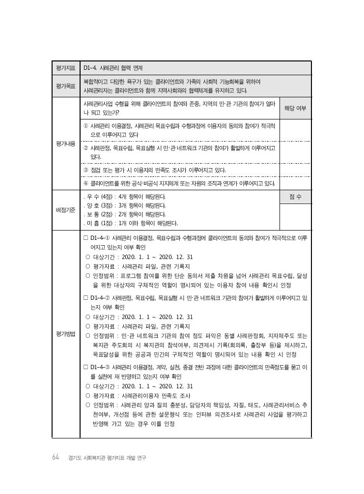 64 경기도 사회복지관 평가지표 개발 연구 평가지표 D1-4. 사례관리 협력 연계 평가목표 복합적이고 다양한 욕구가 있는 클라이언트와 가족의 사회적 기능회복을 위하여 사례관리자는 클라이언트와 함께 지역사회와의 협력체계를 유지하고 있다. 평가내용 사례관리사업 수행을 위해 클라이언트의 참여와 존중, 지역의 민・관 기관의 참여가 얼마 나 되고 있는가? 해당 여부 ① 사례관리 이용결정, 사례관리 목표수립과 수행과정에 이용자의 동의와 참여가 적극적 으로 이루어지고 있다 ② 사례판정, 목표수립, 목표실행 시 민・관 네트워크 기관의 참여가 활발하게 이루어지고 있다. ③ 점검 또는 평가 시 이용자의 만족도 조사가 이루어지고 있다. ④ 클라이언트를 위한 공식・비공식 지지체계 또는 자원의 조직과 연계가 이루어지고 있다. 배점기준 ․ 우 수 (4점) : 4개 항목이 해당된다. ․ 양 호 (3점) : 3개 항목이 해당된다. ․ 보 통 (2점) : 2개 항목이 해당된다. ․ 미 흡 (1점) : 1개 이하 항목이 해당된다. 점 수 평가방법 □ D1-4-① 사례관리 이용결정, 목표수립과 수행과정에 클라이언트의 동의와 참여가 적극적으로 이루 어지고 있는지 여부 확인 ○ 대상기간 : 2020. 1. 1 ~ 2020. 12. 31 ○ 평가자료 : 사례관리 파일, 관련 기록지 ○ 인정범위 : 프로그램 참여를 위한 단순 동의서 제출 차원을 넘어 사례관리 목표수립, 달성 을 위한 대상자의 구체적인 역할이 명시되어 있는 이용자 참여 내용 확인시 인정 □ D1-4-② 사례판정, 목표수립, 목표실행 시 민・관 네트워크 기관의 참여가 활발하게 이루어지고 있 는지 여부 확인 ○ 대상기간 : 2020. 1. 1 ~ 2020. 12. 31 ○ 평가자료 : 사례관리 파일, 관련 기록지 ○ 인정범위 : 민・관 네트워크 기관의 참여 정도 파악은 동별 사례판정회, 지자체주도 또는 복지관 주도회의 시 복지관의 참석여부, 의견제시 기록(회의록, 출장부 등)을 제시하고, 목표달성을 위한 공공과 민간의 구체적인 역할이 명시되어 있는 내용 확인 시 인정 □ D1-4-③ 사례관리 이용결정, 계약, 실천, 종결 전반 과정에 대한 클라이언트의 만족정도를 묻고 이 를 실천에 재 반영하고 있는지 여부 확인 ○ 대상기간 : 2020. 1. 1 ~ 2020. 12. 31 ○ 평가자료 : 사례관리이용자 만족도 조사 ○ 인정범위 : 사례관리 양과 질의 충분성, 담당자의 책임성, 자질, 태도, 사례관리서비스 추 천여부, 개선점 등에 관한 설문형식 또는 인터뷰 의견조사로 사례관리 사업을 평가하고 반영해 가고 있는 경우 이를 인정
