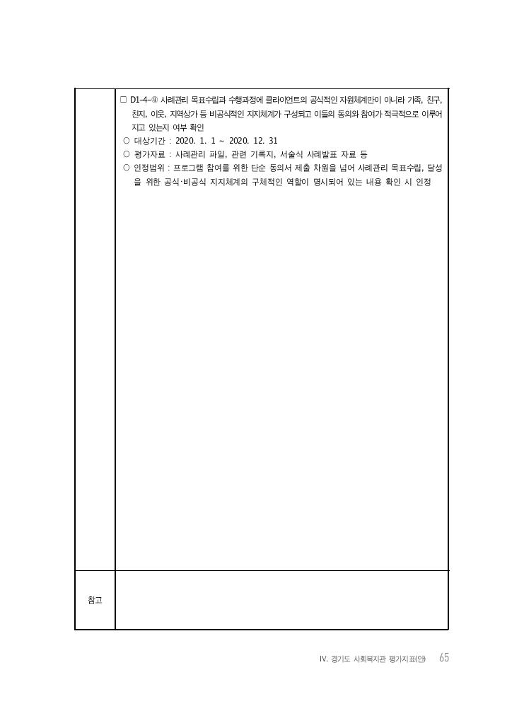 Ⅳ. 경기도 사회복지관 평가지표(안) 65 □ D1-4-④ 사례관리 목표수립과 수행과정에 클라이언트의 공식적인 자원체계만이 아니라 가족, 친구, 친지, 이웃, 지역상가 등 비공식적인 지지체계가 구성되고 이들의 동의와 참여가 적극적으로 이루어 지고 있는지 여부 확인 ○ 대상기간 : 2020. 1. 1 ~ 2020. 12. 31 ○ 평가자료 : 사례관리 파일, 관련 기록지, 서술식 사례발표 자료 등 ○ 인정범위 : 프로그램 참여를 위한 단순 동의서 제출 차원을 넘어 사례관리 목표수립, 달성 을 위한 공식・비공식 지지체계의 구체적인 역할이 명시되어 있는 내용 확인 시 인정 참고