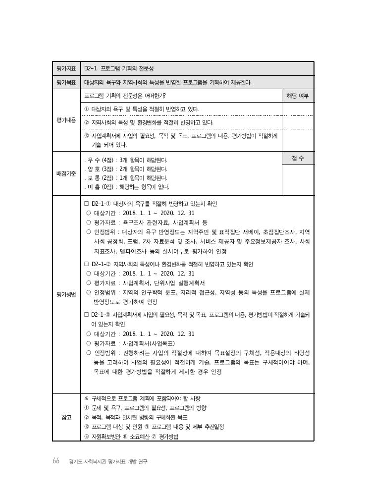 66 경기도 사회복지관 평가지표 개발 연구 평가지표 D2-1. 프로그램 기획의 전문성 평가목표 대상자의 욕구와 지역사회의 특성을 반영한 프로그램을 기획하여 제공한다. 평가내용 프로그램 기획의 전문성은 어떠한가? 해당 여부 ① 대상자의 욕구 및 특성을 적절히 반영하고 있다. ② 지역사회의 특성 및 환경변화를 적절히 반영하고 있다. ③ 사업계획서에 사업의 필요성, 목적 및 목표, 프로그램의 내용, 평가방법이 적절하게 기술 되어 있다. 배점기준 ․ 우 수 (4점) : 3개 항목이 해당된다. ․ 양 호 (3점) : 2개 항목이 해당된다. ․ 보 통 (2점) : 1개 항목이 해당된다. ․ 미 흡 (0점) : 해당하는 항목이 없다. 점 수 평가방법 □ D2-1-① 대상자의 욕구를 적절히 반영하고 있는지 확인 ○ 대상기간 : 2018. 1. 1 ~ 2020. 12. 31 ○ 평가자료 : 욕구조사 관련자료, 사업계획서 등 ○ 인정범위 : 대상자의 욕구 반영정도는 지역주민 및 표적집단 서베이, 초점집단조사, 지역 사회 공청회, 포럼, 2차 자료분석 및 조사, 서비스 제공자 및 주요정보제공자 조사, 사회 지표조사, 델파이조사 등의 실시여부로 평가하여 인정 □ D2-1-② 지역사회의 특성이나 환경변화를 적절히 반영하고 있는지 확인 ○ 대상기간 : 2018. 1. 1 ~ 2020. 12. 31 ○ 평가자료 : 사업계획서, 단위사업 실행계획서 ○ 인정범위 : 지역의 인구학적 분포, 지리적 접근성, 지역성 등의 특성을 프로그램에 실제 반영정도로 평가하여 인정 □ D2-1-③ 사업계획서에 사업의 필요성, 목적 및 목표, 프로그램의 내용, 평가방법이 적절하게 기술되 어 있는지 확인 ○ 대상기간 : 2018. 1. 1 ~ 2020. 12. 31 ○ 평가자료 : 사업계획서(사업목표) ○ 인정범위 : 진행하려는 사업의 적절성에 대하여 목표설정의 구체성, 적용대상의 타당성 등을 고려하여 사업의 필요성이 적절하게 기술, 프로그램의 목표는 구체적이어야 하며, 목표에 대한 평가방법을 적절하게 제시한 경우 인정 참고 ※ 구체적으로 프로그램 계획에 포함되어야 할 사항 ① 문제 및 욕구, 프로그램의 필요성, 프로그램의 방향 ② 목적, 목적과 일치된 방향의 구체화된 목표 ③ 프로그램 대상 및 인원 ④ 프로그램 내용 및 세부 추진일정 ⑤ 자원확보방안 ⑥ 소요예산 ⑦ 평가방법