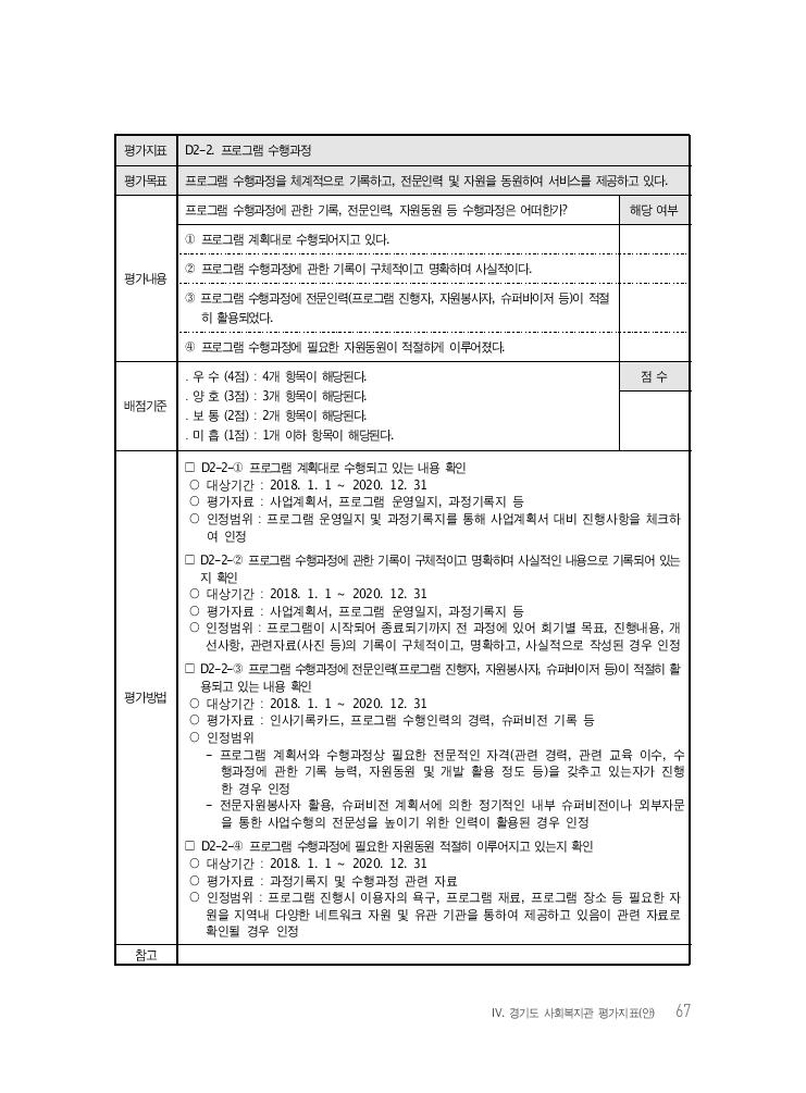 Ⅳ. 경기도 사회복지관 평가지표(안) 67 평가지표 D2-2. 프로그램 수행과정 평가목표 프로그램 수행과정을 체계적으로 기록하고, 전문인력 및 자원을 동원하여 서비스를 제공하고 있다. 평가내용 프로그램 수행과정에 관한 기록, 전문인력, 자원동원 등 수행과정은 어떠한가? 해당 여부 ① 프로그램 계획대로 수행되어지고 있다. ② 프로그램 수행과정에 관한 기록이 구체적이고 명확하며 사실적이다. ③ 프로그램 수행과정에 전문인력(프로그램 진행자, 자원봉사자, 슈퍼바이저 등)이 적절 히 활용되었다. ④ 프로그램 수행과정에 필요한 자원동원이 적절하게 이루어졌다. 배점기준 ․ 우 수 (4점) : 4개 항목이 해당된다. ․ 양 호 (3점) : 3개 항목이 해당된다. ․ 보 통 (2점) : 2개 항목이 해당된다. ․ 미 흡 (1점) : 1개 이하 항목이 해당된다. 점 수 평가방법 □ D2-2-① 프로그램 계획대로 수행되고 있는 내용 확인 ○ 대상기간 : 2018. 1. 1 ~ 2020. 12. 31 ○ 평가자료 : 사업계획서, 프로그램 운영일지, 과정기록지 등 ○ 인정범위 : 프로그램 운영일지 및 과정기록지를 통해 사업계획서 대비 진행사항을 체크하 여 인정 □ D2-2-② 프로그램 수행과정에 관한 기록이 구체적이고 명확하며 사실적인 내용으로 기록되어 있는 지 확인 ○ 대상기간 : 2018. 1. 1 ~ 2020. 12. 31 ○ 평가자료 : 사업계획서, 프로그램 운영일지, 과정기록지 등 ○ 인정범위 : 프로그램이 시작되어 종료되기까지 전 과정에 있어 회기별 목표, 진행내용, 개 선사항, 관련자료(사진 등)의 기록이 구체적이고, 명확하고, 사실적으로 작성된 경우 인정 □ D2-2-③ 프로그램 수행과정에 전문인력(프로그램 진행자, 자원봉사자, 슈퍼바이저 등)이 적절히 활 용되고 있는 내용 확인 ○ 대상기간 : 2018. 1. 1 ~ 2020. 12. 31 ○ 평가자료 : 인사기록카드, 프로그램 수행인력의 경력, 슈퍼비전 기록 등 ○ 인정범위 - 프로그램 계획서와 수행과정상 필요한 전문적인 자격(관련 경력, 관련 교육 이수, 수 행과정에 관한 기록 능력, 자원동원 및 개발 활용 정도 등)을 갖추고 있는자가 진행 한 경우 인정 - 전문자원봉사자 활용, 슈퍼비전 계획서에 의한 정기적인 내부 슈퍼비전이나 외부자문 을 통한 사업수행의 전문성을 높이기 위한 인력이 활용된 경우 인정 □ D2-2-④ 프로그램 수행과정에 필요한 자원동원 적절히 이루어지고 있는지 확인 ○ 대상기간 : 2018. 1. 1 ~ 2020. 12. 31 ○ 평가자료 : 과정기록지 및 수행과정 관련 자료 ○ 인정범위 : 프로그램 진행시 이용자의 욕구, 프로그램 재료, 프로그램 장소 등 필요한 자 원을 지역내 다양한 네트워크 자원 및 유관 기관을 통하여 제공하고 있음이 관련 자료로 확인될 경우 인정 참고