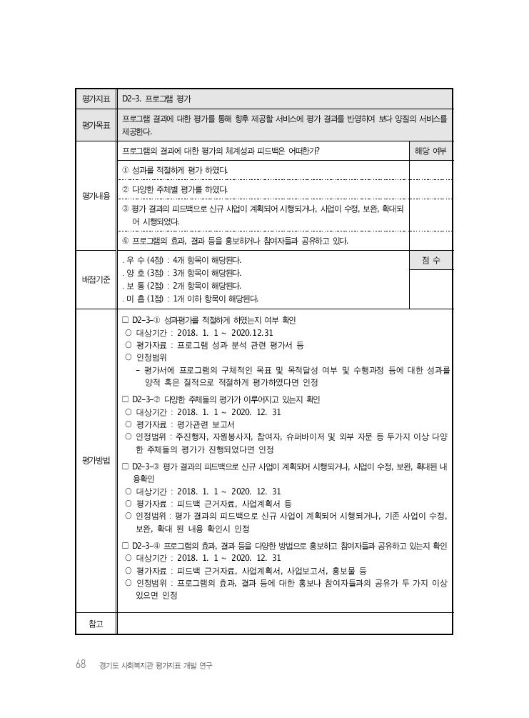 68 경기도 사회복지관 평가지표 개발 연구 평가지표 D2-3. 프로그램 평가 평가목표 프로그램 결과에 대한 평가를 통해 향후 제공할 서비스에 평가 결과를 반영하여 보다 양질의 서비스를 제공한다. 평가내용 프로그램의 결과에 대한 평가의 체계성과 피드백은 어떠한가? 해당 여부 ① 성과를 적절하게 평가 하였다. ② 다양한 주체별 평가를 하였다. ③ 평가 결과의 피드백으로 신규 사업이 계획되어 시행되거나, 사업이 수정, 보완, 확대되 어 시행되었다. ④ 프로그램의 효과, 결과 등을 홍보하거나 참여자들과 공유하고 있다. 배점기준 ․ 우 수 (4점) : 4개 항목이 해당된다. ․ 양 호 (3점) : 3개 항목이 해당된다. ․ 보 통 (2점) : 2개 항목이 해당된다. ․ 미 흡 (1점) : 1개 이하 항목이 해당된다. 점 수 평가방법 □ D2-3-① 성과평가를 적절하게 하였는지 여부 확인 ○ 대상기간 : 2018. 1. 1 ~ 2020.12.31 ○ 평가자료 : 프로그램 성과 분석 관련 평가서 등 ○ 인정범위 - 평가서에 프로그램의 구체적인 목표 및 목적달성 여부 및 수행과정 등에 대한 성과를 양적 혹은 질적으로 적절하게 평가하였다면 인정 □ D2-3-② 다양한 주체들의 평가가 이루어지고 있는지 확인 ○ 대상기간 : 2018. 1. 1 ~ 2020. 12. 31 ○ 평가자료 : 평가관련 보고서 ○ 인정범위 : 주진행자, 자원봉사자, 참여자, 슈퍼바이저 및 외부 자문 등 두가지 이상 다양 한 주체들의 평가가 진행되었다면 인정 □ D2-3-③ 평가 결과의 피드백으로 신규 사업이 계획되어 시행되거나, 사업이 수정, 보완, 확대된 내 용확인 ○ 대상기간 : 2018. 1. 1 ~ 2020. 12. 31 ○ 평가자료 : 피드백 근거자료, 사업계획서 등 ○ 인정범위 : 평가 결과의 피드백으로 신규 사업이 계획되어 시행되거나, 기존 사업이 수정, 보완, 확대 된 내용 확인시 인정 □ D2-3-④ 프로그램의 효과, 결과 등을 다양한 방법으로 홍보하고 참여자들과 공유하고 있는지 확인 ○ 대상기간 : 2018. 1. 1 ~ 2020. 12. 31 ○ 평가자료 : 피드백 근거자료, 사업계획서, 사업보고서, 홍보물 등 ○ 인정범위 : 프로그램의 효과, 결과 등에 대한 홍보나 참여자들과의 공유가 두 가지 이상 있으면 인정 참고
