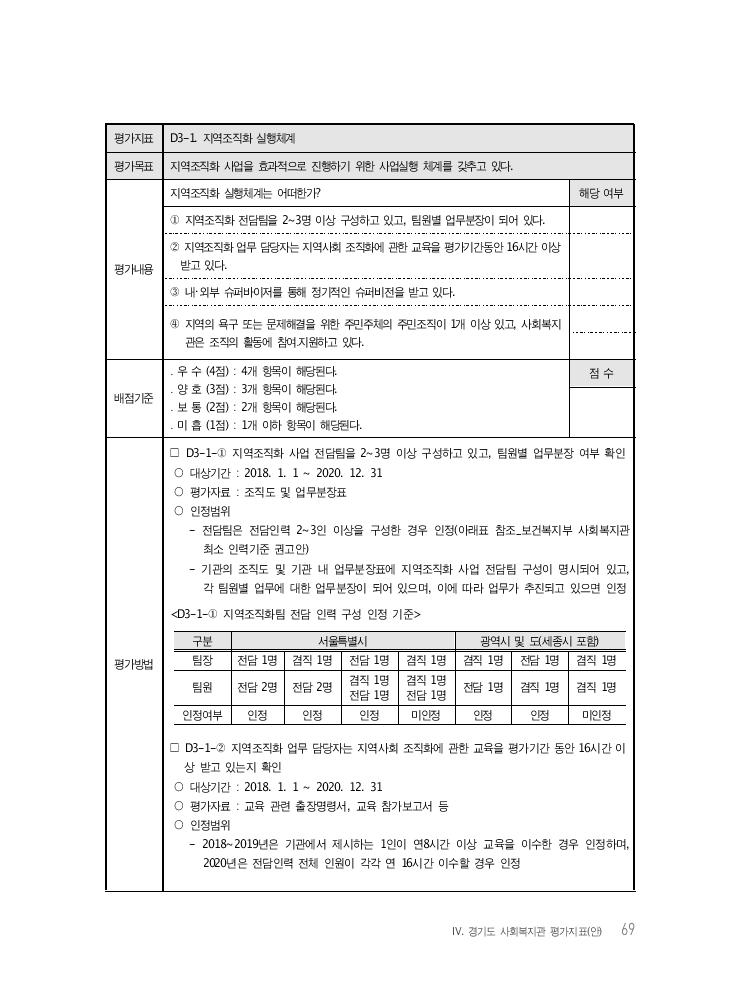 Ⅳ. 경기도 사회복지관 평가지표(안) 69 평가지표 D3-1. 지역조직화 실행체계 평가목표 지역조직화 사업을 효과적으로 진행하기 위한 사업실행 체계를 갖추고 있다. 평가내용 지역조직화 실행체계는 어떠한가? 해당 여부 ① 지역조직화 전담팀을 2~3명 이상 구성하고 있고, 팀원별 업무분장이 되어 있다. ② 지역조직화 업무 담당자는 지역사회 조직화에 관한 교육을 평가기간동안 16시간 이상 받고 있다. ③ 내・외부 슈퍼바이저를 통해 정기적인 슈퍼비전을 받고 있다. ④ 지역의 욕구 또는 문제해결을 위한 주민주체의 주민조직이 1개 이상 있고, 사회복지 관은 조직의 활동에 참여․지원하고 있다. 배점기준 ․ 우 수 (4점) : 4개 항목이 해당된다. ․ 양 호 (3점) : 3개 항목이 해당된다. ․ 보 통 (2점) : 2개 항목이 해당된다. ․ 미 흡 (1점) : 1개 이하 항목이 해당된다. 점 수 평가방법 □ D3-1-① 지역조직화 사업 전담팀을 2~3명 이상 구성하고 있고, 팀원별 업무분장 여부 확인 ○ 대상기간 : 2018. 1. 1 ~ 2020. 12. 31 ○ 평가자료 : 조직도 및 업무분장표 ○ 인정범위 - 전담팀은 전담인력 2~3인 이상을 구성한 경우 인정(아래표 참조_보건복지부 사회복지관 최소 인력기준 권고안) - 기관의 조직도 및 기관 내 업무분장표에 지역조직화 사업 전담팀 구성이 명시되어 있고, 각 팀원별 업무에 대한 업무분장이 되어 있으며, 이에 따라 업무가 추진되고 있으면 인정 <D3-1-① 지역조직화팀 전담 인력 구성 인정 기준> 구분 서울특별시 광역시 및 도(세종시 포함) 팀장 전담 1명 겸직 1명 전담 1명 겸직 1명 겸직 1명 전담 1명 겸직 1명 팀원 전담 2명 전담 2명 겸직 1명전담 1명 겸직 1명 전담 1명 전담 1명 겸직 1명 겸직 1명 인정여부 인정 인정 인정 미인정 인정 인정 미인정 □ D3-1-② 지역조직화 업무 담당자는 지역사회 조직화에 관한 교육을 평가기간 동안 16시간 이 상 받고 있는지 확인 ○ 대상기간 : 2018. 1. 1 ~ 2020. 12. 31 ○ 평가자료 : 교육 관련 출장명령서, 교육 참가보고서 등 ○ 인정범위 - 2018~2019년은 기관에서 제시하는 1인이 연8시간 이상 교육을 이수한 경우 인정하며, 2020년은 전담인력 전체 인원이 각각 연 16시간 이수할 경우 인정