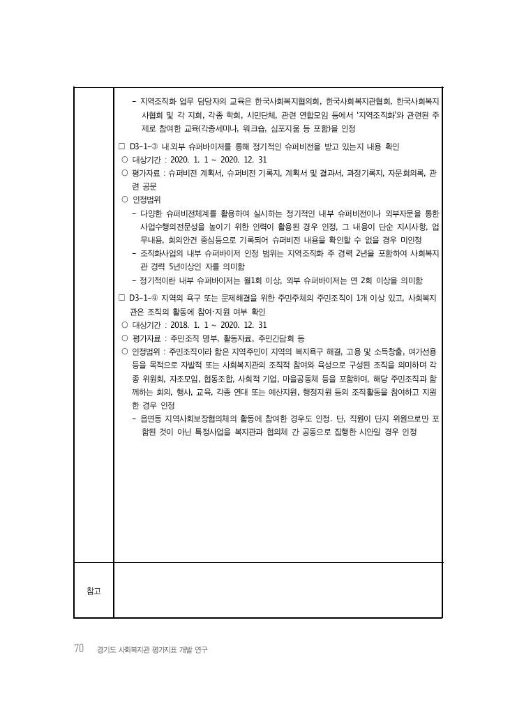 70 경기도 사회복지관 평가지표 개발 연구 - 지역조직화 업무 담당자의 교육은 한국사회복지협의회, 한국사회복지관협회, 한국사회복지 사협회 및 각 지회, 각종 학회, 시민단체, 관련 연합모임 등에서 ‘지역조직화’와 관련된 주 제로 참여한 교육(각종세미나, 워크숍, 심포지움 등 포함)을 인정 □ D3-1-③ 내․외부 슈퍼바이저를 통해 정기적인 슈퍼비전을 받고 있는지 내용 확인 ○ 대상기간 : 2020. 1. 1 ~ 2020. 12. 31 ○ 평가자료 : 슈퍼비전 계획서, 슈퍼비전 기록지, 계획서 및 결과서, 과정기록지, 자문회의록, 관 련 공문 ○ 인정범위 - 다양한 슈퍼비전체계를 활용하여 실시하는 정기적인 내부 슈퍼비전이나 외부자문을 통한 사업수행의전문성을 높이기 위한 인력이 활용된 경우 인정, 그 내용이 단순 지시사항, 업 무내용, 회의안건 중심등으로 기록되어 슈퍼비전 내용을 확인할 수 없을 경우 미인정 - 조직화사업의 내부 슈퍼바이저 인정 범위는 지역조직화 주 경력 2년을 포함하여 사회복지 관 경력 5년이상인 자를 의미함 - 정기적이란 내부 슈퍼바이저는 월1회 이상, 외부 슈퍼바이저는 연 2회 이상을 의미함 □ D3-1-④ 지역의 욕구 또는 문제해결을 위한 주민주체의 주민조직이 1개 이상 있고, 사회복지 관은 조직의 활동에 참여・지원 여부 확인 ○ 대상기간 : 2018. 1. 1 ~ 2020. 12. 31 ○ 평가자료 : 주민조직 명부, 활동자료, 주민간담회 등 ○ 인정범위 : 주민조직이라 함은 지역주민이 지역의 복지욕구 해결, 고용 및 소득창출, 여가선용 등을 목적으로 자발적 또는 사회복지관의 조직적 참여와 육성으로 구성된 조직을 의미하며 각 종 위원회, 자조모임, 협동조합, 사회적 기업, 마을공동체 등을 포함하며, 해당 주민조직과 함 께하는 회의, 행사, 교육, 각종 연대 또는 예산지원, 행정지원 등의 조직활동을 참여하고 지원 한 경우 인정 - 읍면동 지역사회보장협의체의 활동에 참여한 경우도 인정. 단, 직원이 단지 위원으로만 포 함된 것이 아닌 특정사업을 복지관과 협의체 간 공동으로 집행한 시안일 경우 인정 참고