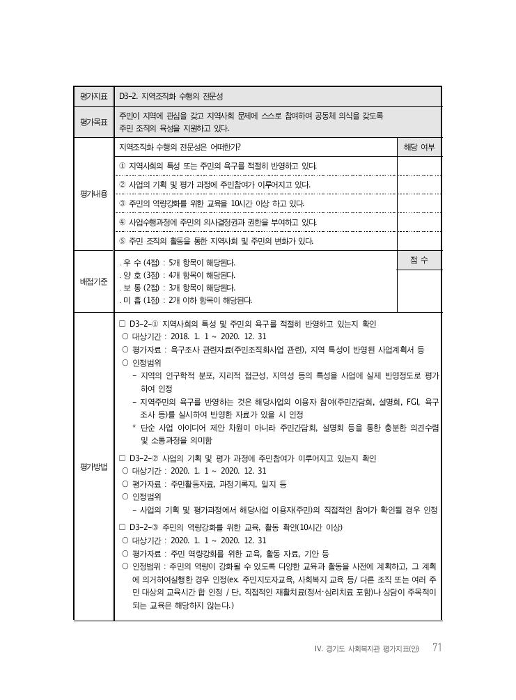 Ⅳ. 경기도 사회복지관 평가지표(안) 71 평가지표 D3-2. 지역조직화 수행의 전문성 평가목표 주민이 지역에 관심을 갖고 지역사회 문제에 스스로 참여하여 공동체 의식을 갖도록 주민 조직의 육성을 지원하고 있다. 평가내용 지역조직화 수행의 전문성은 어떠한가? 해당 여부 ① 지역사회의 특성 또는 주민의 욕구를 적절히 반영하고 있다. ② 사업의 기획 및 평가 과정에 주민참여가 이루어지고 있다. ③ 주민의 역량강화를 위한 교육을 10시간 이상 하고 있다. ④ 사업수행과정에 주민의 의사결정권과 권한을 부여하고 있다. ⑤ 주민 조직의 활동을 통한 지역사회 및 주민의 변화가 있다. 배점기준 ․ 우 수 (4점) : 5개 항목이 해당된다. ․ 양 호 (3점) : 4개 항목이 해당된다. ․ 보 통 (2점) : 3개 항목이 해당된다. ․ 미 흡 (1점) : 2개 이하 항목이 해당된다. 점 수 평가방법 □ D3-2-① 지역사회의 특성 및 주민의 욕구를 적절히 반영하고 있는지 확인 ○ 대상기간 : 2018. 1. 1 ~ 2020. 12. 31 ○ 평가자료 : 욕구조사 관련자료(주민조직화사업 관련), 지역 특성이 반영된 사업계획서 등 ○ 인정범위 - 지역의 인구학적 분포, 지리적 접근성, 지역성 등의 특성을 사업에 실제 반영정도로 평가 하여 인정 - 지역주민의 욕구를 반영하는 것은 해당사업의 이용자 참여(주민간담회, 설명회, FGI, 욕구 조사 등)를 실시하여 반영한 자료가 있을 시 인정 * 단순 사업 아이디어 제안 차원이 아니라 주민간담회, 설명회 등을 통한 충분한 의견수렴 및 소통과정을 의미함 □ D3-2-② 사업의 기획 및 평가 과정에 주민참여가 이루어지고 있는지 확인 ○ 대상기간 : 2020. 1. 1 ~ 2020. 12. 31 ○ 평가자료 : 주민활동자료, 과정기록지, 일지 등 ○ 인정범위 - 사업의 기획 및 평가과정에서 해당사업 이용자(주민)의 직접적인 참여가 확인될 경우 인정 □ D3-2-③ 주민의 역량강화를 위한 교육, 활동 확인(10시간 이상) ○ 대상기간 : 2020. 1. 1 ~ 2020. 12. 31 ○ 평가자료 : 주민 역량강화를 위한 교육, 활동 자료, 기안 등 ○ 인정범위 : 주민의 역량이 강화될 수 있도록 다양한 교육과 활동을 사전에 계획하고, 그 계획 에 의거하여실행한 경우 인정(ex. 주민지도자교육, 사회복지 교육 등/ 다른 조직 또는 여러 주 민 대상의 교육시간 합 인정 / 단, 직접적인 재활치료(정서・심리치료 포함)나 상담이 주목적이 되는 교육은 해당하지 않는다.)