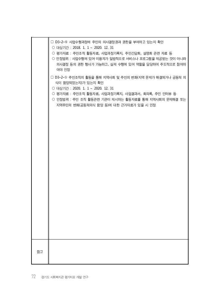 72 경기도 사회복지관 평가지표 개발 연구 □ D3-2-④ 사업수행과정에 주민의 의사결정권과 권한을 부여하고 있는지 확인 ○ 대상기간 : 2018. 1. 1 ~ 2020. 12. 31 ○ 평가자료 : 주민조직 활동자료, 사업과정기록지, 주민간담회, 설명회 관련 자료 등 ○ 인정범위 : 사업수행에 있어 이용자가 일방적으로 서비스나 프로그램을 제공받는 것이 아니라 의사결정 등의 권한 행사가 가능하고, 실제 수행에 있어 역할을 담당하여 주도적으로 참여하 여야 인정 □ D3-2-⑤ 주민조직의 활동을 통해 지역사회 및 주민의 변화(지역 문제가 해결되거나 공동체 의 식이 함양되었는지)가 있는지 확인 ○ 대상기간 : 2020. 1. 1 ~ 2020. 12. 31 ○ 평가자료 : 주민조직 활동자료, 사업과정기록지, 사업결과서, 회의록, 주민 인터뷰 등 ○ 인정범위 : 주민 조직 활동관련 기관이 제시하는 활동자료를 통해 지역사회의 문제해결 또는 지역주민의 변화(공동체의식 함양 등)에 대한 근거자료가 있을 시 인정 참고