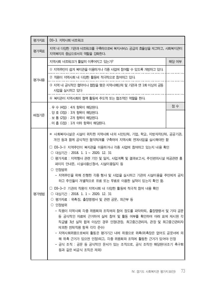 Ⅳ. 경기도 사회복지관 평가지표(안) 73 평가지표 D3-3. 지역사회 네트워크 평가목표 지역 내 다양한 기관과 네트워크를 구축하므로써 복지서비스 공급의 효율성을 제고하고, 사회복지관이 지역복지의 중심으로서의 역할을 강화한다. 평가내용 지역사회 네트워크가 활발히 이루어지고 있는가? 해당 여부 ① 지역주민이 쉽게 복지관을 이용하거나 각종 사업에 참여할 수 있도록 개방하고 있다. ② 직원이 지역사회 내 다양한 활동에 적극적으로 참여하고 있다. ③ 지역 내 공식적인 협약이나 협정을 맺은 지역사회단체 및 기관과 연 1회 이상의 공동 사업을 실시하고 있다 ④ 복지관이 지역사회의 협력 활동에 주도적 또는 협조적인 역할을 한다. 배점기준 ․ 우 수 (4점) : 4개 항목이 해당된다. ․ 양 호 (3점) : 3개 항목이 해당된다. ․ 보 통 (2점) : 2개 항목이 해당된다. ․ 미 흡 (1점) : 1개 이하 항목이 해당된다. 점 수 평가방법 ※ 사회복지시설은 시설이 위치한 지역사회 내의 시민단체, 기업, 학교, 지방자치단체, 공공기관, 개인 등과 함께 공식적인 협약체계를 구축하여 지역사회 연계사업을 실시해야만 함 □ D3-3-① 지역주민이 복지관을 이용하거나 각종 사업에 참여하고 있는지 내용 확인 ○ 대상기간 : 2018. 1. 1 ~ 2020. 12. 31 ○ 평가자료 : 지역행사 관련 기안 및 일지, 사업계획 및 결과보고서, 주민편의시설 제공관련 홈 페이지 안내문, 시설사용신청서, 시설이용일지 등 ○ 인정범위 - 지역주민을 위해 진행한 각종 행사 및 사업을 실시하고 기관의 시설이용을 주민에게 공지 하고 주민들이 개별적으로 유료 또는 무료로 이용한 실적이 있는지 확인 함. □ D3-3-② 기관의 직원이 지역사회 내 다양한 활동에 적극적 참여 내용 확인 ○ 대상기간 : 2018. 1. 1 ~ 2020. 12. 31 ○ 평가자료 : 위촉장, 출장명령서 및 관련 공문, 외근부 등 ○ 인정범위 - 직원이 지역사회 각종 위원회와 조직에의 참여 정도를 파악하되, 출장명령서 및 기타 공문 등 공식적인 자료에 근거하여 실제 참여 및 활동 여부를 확인하여 아래 표에 제시된 각 직급별 3년 실적 합계 이상인 경우 인정(관장, 최고중간관리자, 관장 및 최고중간관리자 제외한 전체직원 항목 각각 준수) - 지역사회위원으로써의 활동은 평가기간 내에 위원으로 위촉(위촉장은 없어도 공문서에 의 해 위촉 근거가 있으면 인정)되고, 각종 위원회와 조직에 활동한 근거가 있어야 인정 - 공식 조직 : 공문 등 공식적인 문서가 있는 조직으로, 공식 조직만 해당된다(조기 축구회 등과 같은 비공식 조직은 제외)