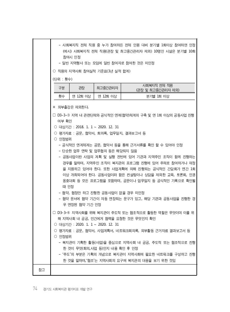 74 경기도 사회복지관 평가지표 개발 연구 - 사회복지직 전체 직원 중 누가 참여하든 전체 인원 대비 분기별 1회이상 참여하면 인정 (예시) 사회복지직 전체 직원(관장 및 최고중간관리자 제외) 10명인 시설은 분기별 10회 참여시 인정 - 일반 지역행사 또는 모임에 일반 참여자로 참여한 것은 미인정 ○ 직원의 지역사회 참여실적 기준표(3년 실적 합계) (단위 : 횟수) 구분 관장 최고중간관리자 사회복지직 전체 직원(관장 및 최고중간관리자 제외) 횟수 연 12회 이상 연 12회 이상 분기별 1회 이상 ※ 외부출강은 제외한다. □ D3-3-③ 지역 내 관련단체와 공식적인 연계(협약)체계의 구축 및 연 1회 이상의 공동사업 진행 여부 확인 ○ 대상기간 : 2018. 1. 1 ~ 2020. 12. 31 ○ 평가자료 : 공문, 협약서, 회의록, 업무일지, 결과보고서 등 ○ 인정범위 - 공식적인 연계체계는 공문, 협약서 등을 통해 근거서류를 확인 할 수 있어야 인정 - 단순한 업무 연락 및 업무협의 등은 해당되지 않음 - 공동사업이란 사업의 계획 및 실행 전반에 있어 기관과 지역주민 조직이 함께 진행하는 경우를 말하며, 지역주민 조직이 복지관의 프로그램 진행에 있어 주체로 참여하거나 재정 을 지원하고 있어야 한다. 또한 사업계획에 의해 진행되는 공식적인 간담회가 연간 1회 이상 개최되어야 한다. 공동사업이라 함은 컨설팅이나 상담을 제외한 교육, 토론회, 인권 옹호대회 등 모든 프로그램을 포함하며, 공문이나 업무일지 등 공식적인 기록으로 확인될 때 인정 - 협약, 협정만 하고 진행한 공동사업이 없을 경우 미인정 - 협약 문서에 협약 기간이 자동 연장되는 문구가 있고, 해당 기관과 공동사업을 진행한 경 우 연장된 협약 기간 인정 □ D3-3-④ 지역사회를 위해 복지관이 주도적 또는 협조적으로 활동한 역할은 무엇이며 이를 위 해 지역사회 내 공공, 민간에게 협력을 요청한 것은 무엇인지 확인 ○ 대상기간 : 2020. 1. 1 ~ 2020. 12. 31 ○ 평가자료 : 공문, 협약서, 사업계획서, 네트워크회의록, 외부활동 근거자료 결과보고서 등 ○ 인정범위 - 복지관이 기획한 활동(사업)을 중심으로 지역사회 내 공공, 주도적 또는 협조적으로 진행 한 것이 무엇(회의,사업 등)인지 내용 확인 후 인정 - ‘주도’의 부분은 기획의 개념으로 복지관이 지역사회에 필요한 네트워크를 구성하고 진행 한 것을 말하며,‘협조’는 지역사회의 요구에 복지관의 대응을 보기 위한 것임 참고
