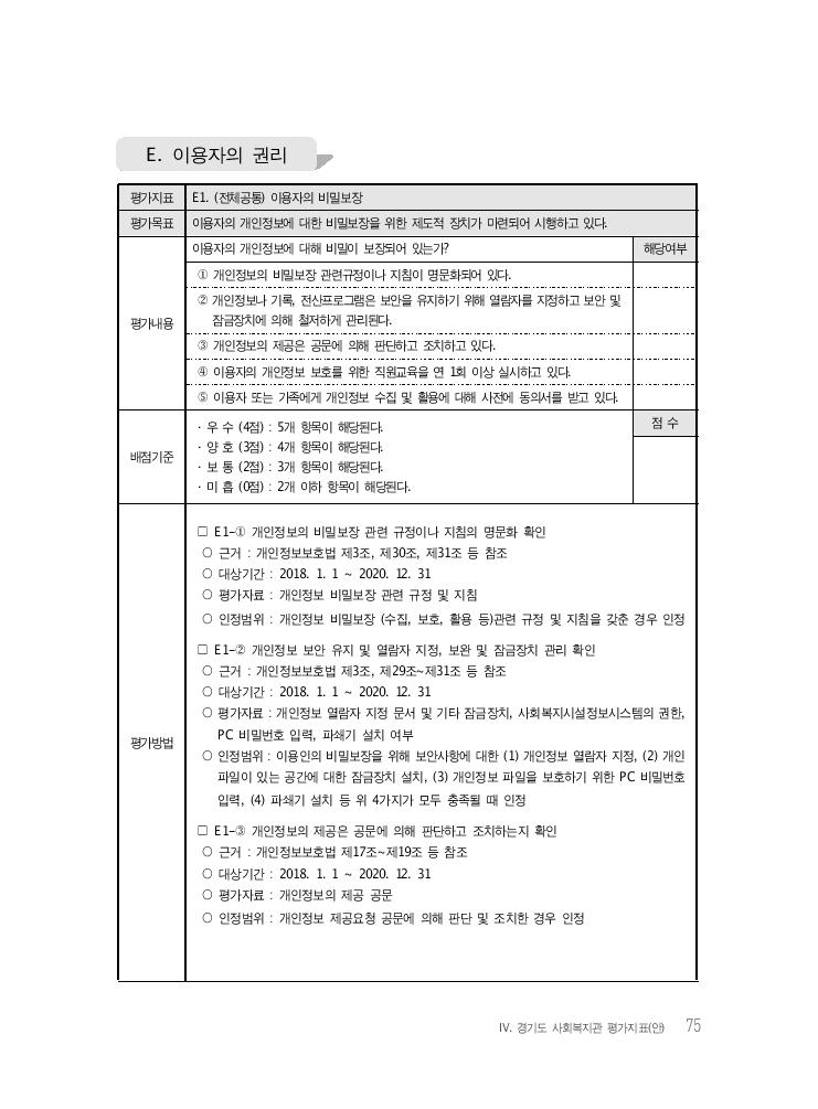 Ⅳ. 경기도 사회복지관 평가지표(안) 75 평가지표 E1. (전체공통) 이용자의 비밀보장 평가목표 이용자의 개인정보에 대한 비밀보장을 위한 제도적 장치가 마련되어 시행하고 있다. 평가내용 이용자의 개인정보에 대해 비밀이 보장되어 있는가? 해당여부 ① 개인정보의 비밀보장 관련규정이나 지침이 명문화되어 있다. ② 개인정보나 기록, 전산프로그램은 보안을 유지하기 위해 열람자를 지정하고 보안 및 잠금장치에 의해 철저하게 관리된다. ③ 개인정보의 제공은 공문에 의해 판단하고 조치하고 있다. ④ 이용자의 개인정보 보호를 위한 직원교육을 연 1회 이상 실시하고 있다. ⑤ 이용자 또는 가족에게 개인정보 수집 및 활용에 대해 사전에 동의서를 받고 있다. 배점기준 · 우 수 (4점) : 5개 항목이 해당된다. · 양 호 (3점) : 4개 항목이 해당된다. · 보 통 (2점) : 3개 항목이 해당된다. · 미 흡 (0점) : 2개 이하 항목이 해당된다. 점 수 평가방법 □ E1-① 개인정보의 비밀보장 관련 규정이나 지침의 명문화 확인 ○ 근거 : 개인정보보호법 제3조, 제30조, 제31조 등 참조 ○ 대상기간 : 2018. 1. 1 ~ 2020. 12. 31 ○ 평가자료 : 개인정보 비밀보장 관련 규정 및 지침 ○ 인정범위 : 개인정보 비밀보장 (수집, 보호, 활용 등)관련 규정 및 지침을 갖춘 경우 인정 □ E1-② 개인정보 보안 유지 및 열람자 지정, 보완 및 잠금장치 관리 확인 ○ 근거 : 개인정보보호법 제3조, 제29조~제31조 등 참조 ○ 대상기간 : 2018. 1. 1 ~ 2020. 12. 31 ○ 평가자료 : 개인정보 열람자 지정 문서 및 기타 잠금장치, 사회복지시설정보시스템의 권한, PC 비밀번호 입력, 파쇄기 설치 여부 ○ 인정범위 : 이용인의 비밀보장을 위해 보안사항에 대한 (1) 개인정보 열람자 지정, (2) 개인 파일이 있는 공간에 대한 잠금장치 설치, (3) 개인정보 파일을 보호하기 위한 PC 비밀번호 입력, (4) 파쇄기 설치 등 위 4가지가 모두 충족될 때 인정 □ E1-③ 개인정보의 제공은 공문에 의해 판단하고 조치하는지 확인 ○ 근거 : 개인정보보호법 제17조~제19조 등 참조 ○ 대상기간 : 2018. 1. 1 ~ 2020. 12. 31 ○ 평가자료 : 개인정보의 제공 공문 ○ 인정범위 : 개인정보 제공요청 공문에 의해 판단 및 조치한 경우 인정 E. 이용자의 권리