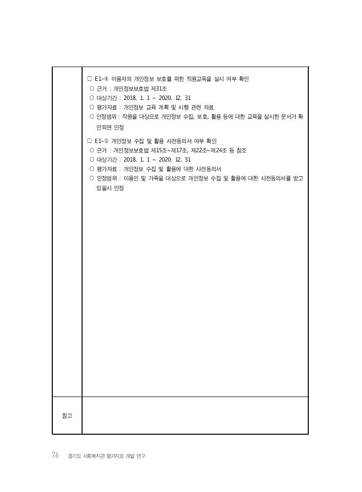 76 경기도 사회복지관 평가지표 개발 연구 □ E1-④ 이용자의 개인정보 보호를 위한 직원교육을 실시 여부 확인 ○ 근거 : 개인정보보호법 제31조 ○ 대상기간 : 2018. 1. 1 ~ 2020. 12. 31 ○ 평가자료 : 개인정보 교육 계획 및 시행 관련 자료 ○ 인정범위 : 직원을 대상으로 개인정보 수집, 보호, 활용 등에 대한 교육을 실시한 문서가 확 인되면 인정 □ E1-⑤ 개인정보 수집 및 활용 사전동의서 여부 확인 ○ 근거 : 개인정보보호법 제15조~제17조, 제22조~제24조 등 참조 ○ 대상기간 : 2018. 1. 1 ~ 2020. 12. 31 ○ 평가자료 : 개인정보 수집 및 활용에 대한 사전동의서 ○ 인정범위 : 이용인 및 가족을 대상으로 개인정보 수집 및 활용에 대한 사전동의서를 받고 있을시 인정 참고