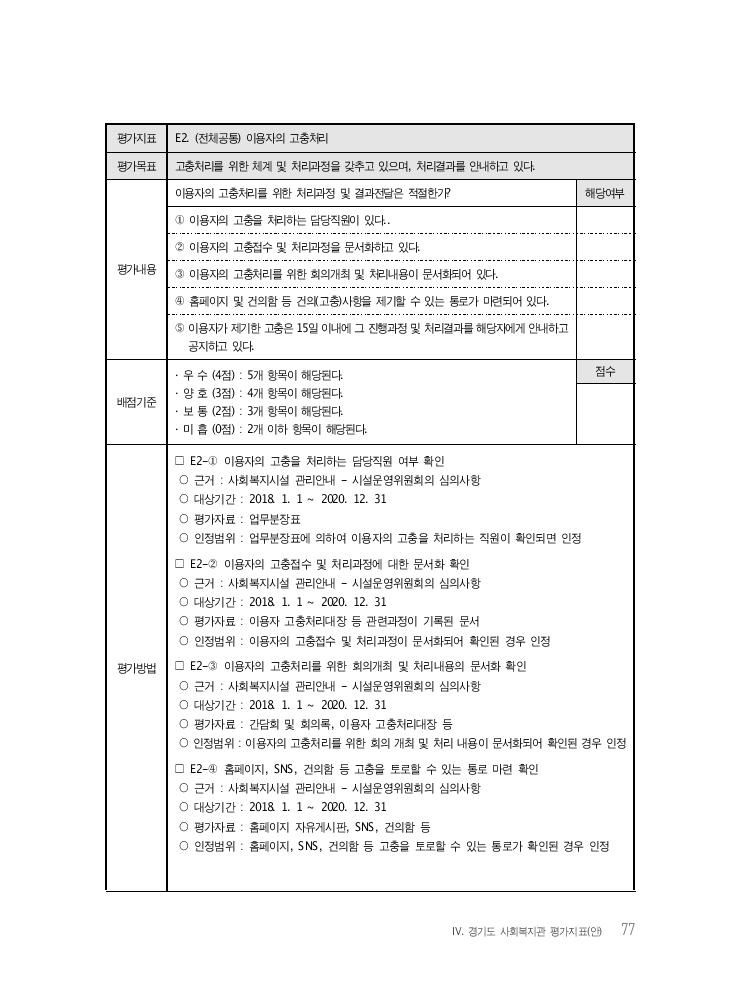 Ⅳ. 경기도 사회복지관 평가지표(안) 77 평가지표 E2. (전체공통) 이용자의 고충처리 평가목표 고충처리를 위한 체계 및 처리과정을 갖추고 있으며, 처리결과를 안내하고 있다. 평가내용 이용자의 고충처리를 위한 처리과정 및 결과전달은 적절한가? 해당여부 ① 이용자의 고충을 처리하는 담당직원이 있다.. ② 이용자의 고충접수 및 처리과정을 문서화하고 있다. ③ 이용자의 고충처리를 위한 회의개최 및 처리내용이 문서화되어 있다. ④ 홈페이지 및 건의함 등 건의(고충)사항을 제기할 수 있는 통로가 마련되어 있다. ⑤ 이용자가 제기한 고충은 15일 이내에 그 진행과정 및 처리결과를 해당자에게 안내하고 공지하고 있다. 배점기준 · 우 수 (4점) : 5개 항목이 해당된다. · 양 호 (3점) : 4개 항목이 해당된다. · 보 통 (2점) : 3개 항목이 해당된다. · 미 흡 (0점) : 2개 이하 항목이 해당된다. 점수 평가방법 □ E2-① 이용자의 고충을 처리하는 담당직원 여부 확인 ○ 근거 : 사회복지시설 관리안내 - 시설운영위원회의 심의사항 ○ 대상기간 : 2018. 1. 1 ~ 2020. 12. 31 ○ 평가자료 : 업무분장표 ○ 인정범위 : 업무분장표에 의하여 이용자의 고충을 처리하는 직원이 확인되면 인정 □ E2-② 이용자의 고충접수 및 처리과정에 대한 문서화 확인 ○ 근거 : 사회복지시설 관리안내 - 시설운영위원회의 심의사항 ○ 대상기간 : 2018. 1. 1 ~ 2020. 12. 31 ○ 평가자료 : 이용자 고충처리대장 등 관련과정이 기록된 문서 ○ 인정범위 : 이용자의 고충접수 및 처리과정이 문서화되어 확인된 경우 인정 □ E2-③ 이용자의 고충처리를 위한 회의개최 및 처리내용의 문서화 확인 ○ 근거 : 사회복지시설 관리안내 - 시설운영위원회의 심의사항 ○ 대상기간 : 2018. 1. 1 ~ 2020. 12. 31 ○ 평가자료 : 간담회 및 회의록, 이용자 고충처리대장 등 ○ 인정범위 : 이용자의 고충처리를 위한 회의 개최 및 처리 내용이 문서화되어 확인된 경우 인정 □ E2-④ 홈페이지, SNS, 건의함 등 고충을 토로할 수 있는 통로 마련 확인 ○ 근거 : 사회복지시설 관리안내 - 시설운영위원회의 심의사항 ○ 대상기간 : 2018. 1. 1 ~ 2020. 12. 31 ○ 평가자료 : 홈페이지 자유게시판, SNS, 건의함 등 ○ 인정범위 : 홈페이지, SNS, 건의함 등 고충을 토로할 수 있는 통로가 확인된 경우 인정