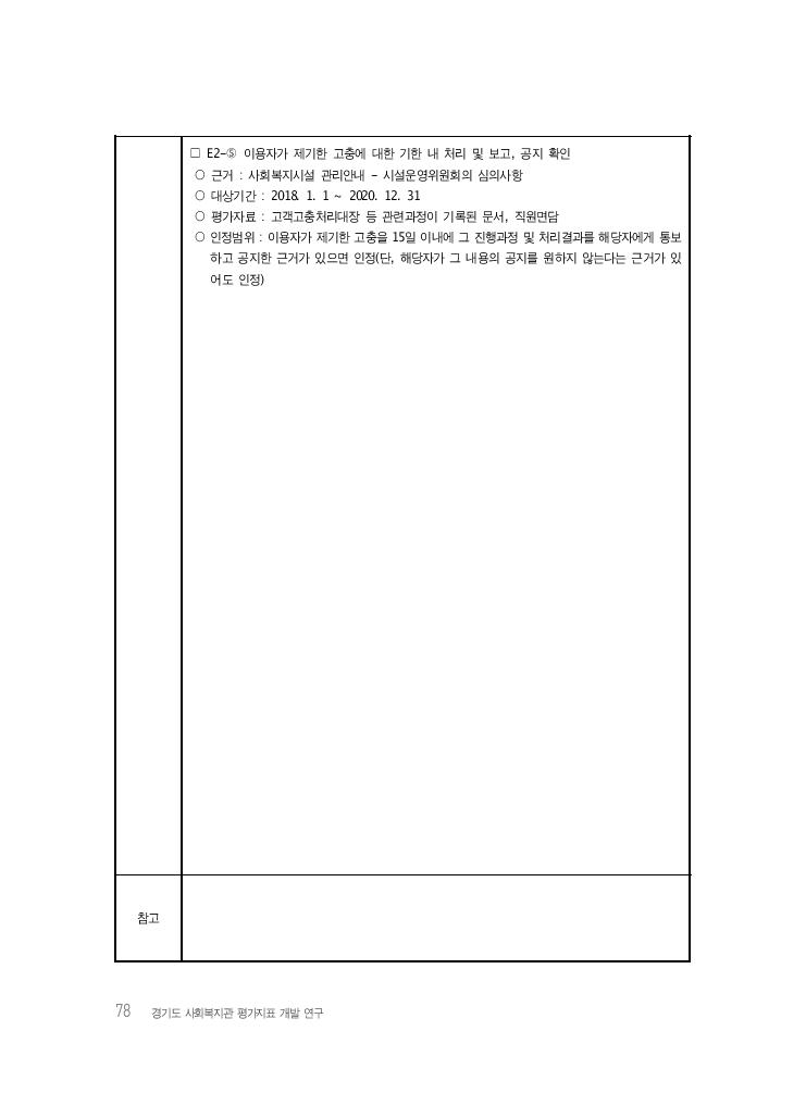 78 경기도 사회복지관 평가지표 개발 연구 □ E2-⑤ 이용자가 제기한 고충에 대한 기한 내 처리 및 보고, 공지 확인 ○ 근거 : 사회복지시설 관리안내 - 시설운영위원회의 심의사항 ○ 대상기간 : 2018. 1. 1 ~ 2020. 12. 31 ○ 평가자료 : 고객고충처리대장 등 관련과정이 기록된 문서, 직원면담 ○ 인정범위 : 이용자가 제기한 고충을 15일 이내에 그 진행과정 및 처리결과를 해당자에게 통보 하고 공지한 근거가 있으면 인정(단, 해당자가 그 내용의 공지를 원하지 않는다는 근거가 있 어도 인정) 참고