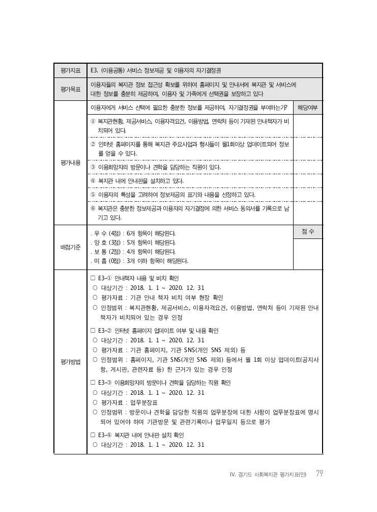 Ⅳ. 경기도 사회복지관 평가지표(안) 79 평가지표 E3. (이용공통) 서비스 정보제공 및 이용자의 자기결정권 평가목표 이용자들의 복지관 정보 접근성 확보를 위하여 홈페이지 및 안내서에 복지관 및 서비스에대한 정보를 충분히 제공하며, 이용자 및 가족에게 선택권을 보장하고 있다 평가내용 이용자에게 서비스 선택에 필요한 충분한 정보를 제공하며, 자기결정권을 부여하는가? 해당여부 ① 복지관현황, 제공서비스, 이용자격요건, 이용방법, 연락처 등이 기재된 안내책자가 비 치되어 있다. ② 인터넷 홈페이지를 통해 복지관 주요사업과 행사들이 월1회이상 업데이트되어 정보 를 얻을 수 있다. ③ 이용희망자의 방문이나 견학을 담당하는 직원이 있다. ④ 복지관 내에 안내판을 설치하고 있다. ⑤ 이용자의 특성을 고려하여 정보제공의 표기와 내용을 선정하고 있다. ⑥ 복지관은 충분한 정보제공과 이용자의 자기결정에 의한 서비스 동의서를 기록으로 남 기고 있다. 배점기준 ․ 우 수 (4점) : 6개 항목이 해당된다. ․ 양 호 (3점) : 5개 항목이 해당된다. ․ 보 통 (2점) : 4개 항목이 해당된다. ․ 미 흡 (0점) : 3개 이하 항목이 해당된다. 점 수 평가방법 □ E3-① 안내책자 내용 및 비치 확인 ○ 대상기간 : 2018. 1. 1 ~ 2020. 12. 31 ○ 평가자료 : 기관 안내 책자 비치 여부 현장 확인 ○ 인정범위 : 복지관현황, 제공서비스, 이용자격요건, 이용방법, 연락처 등이 기재된 안내 책자가 비치되어 있는 경우 인정 □ E3-② 인터넷 홈페이지 업데이트 여부 및 내용 확인 ○ 대상기간 : 2018. 1. 1 ~ 2020. 12. 31 ○ 평가자료 : 기관 홈페이지, 기관 SNS(개인 SNS 제외) 등 ○ 인정범위 : 홈페이지, 기관 SNS(개인 SNS 제외) 등에서 월 1회 이상 업데이트(공지사 항, 게시판, 관련자료 등) 한 근거가 있는 경우 인정 □ E3-③ 이용희망자의 방문이나 견학을 담당하는 직원 확인 ○ 대상기간 : 2018. 1. 1 ~ 2020. 12. 31 ○ 평가자료 : 업무분장표 ○ 인정범위 : 방문이나 견학을 담당한 직원의 업무분장에 대한 사항이 업무분장표에 명시 되어 있어야 하며 기관방문 및 관련기록이나 업무일지 등으로 평가 □ E3-④ 복지관 내에 안내판 설치 확인 ○ 대상기간 : 2018. 1. 1 ~ 2020. 12. 31