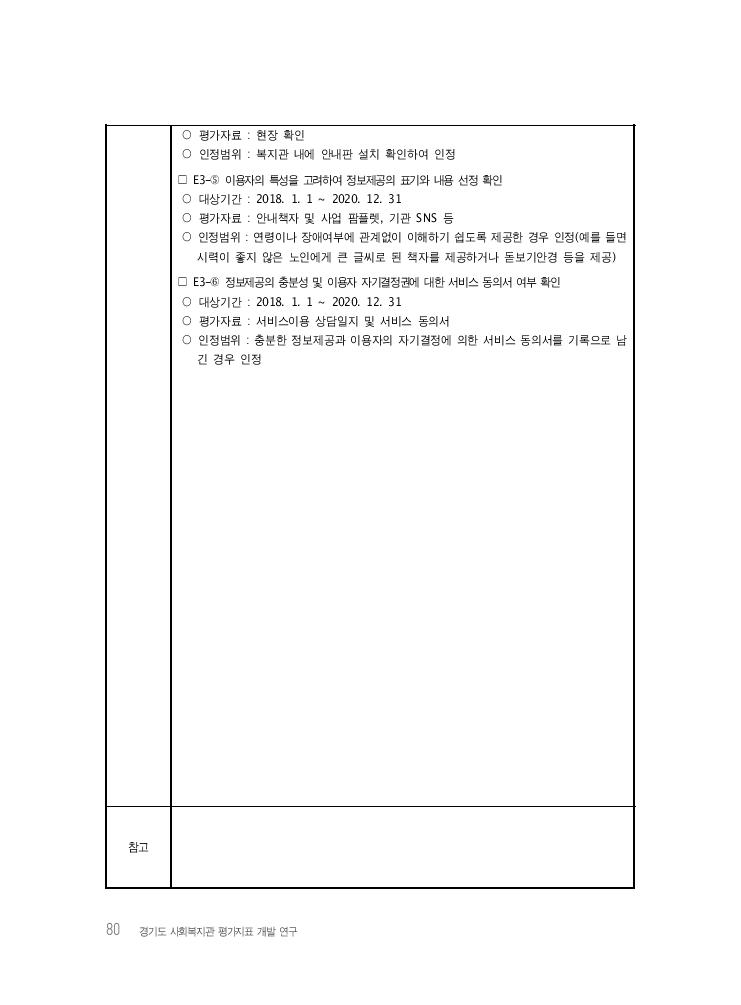 80 경기도 사회복지관 평가지표 개발 연구 ○ 평가자료 : 현장 확인 ○ 인정범위 : 복지관 내에 안내판 설치 확인하여 인정 □ E3-⑤ 이용자의 특성을 고려하여 정보제공의 표기와 내용 선정 확인 ○ 대상기간 : 2018. 1. 1 ~ 2020. 12. 31 ○ 평가자료 : 안내책자 및 사업 팜플렛, 기관 SNS 등 ○ 인정범위 : 연령이나 장애여부에 관계없이 이해하기 쉽도록 제공한 경우 인정(예를 들면 시력이 좋지 않은 노인에게 큰 글씨로 된 책자를 제공하거나 돋보기안경 등을 제공) □ E3-⑥ 정보제공의 충분성 및 이용자 자기결정권에 대한 서비스 동의서 여부 확인 ○ 대상기간 : 2018. 1. 1 ~ 2020. 12. 31 ○ 평가자료 : 서비스이용 상담일지 및 서비스 동의서 ○ 인정범위 : 충분한 정보제공과 이용자의 자기결정에 의한 서비스 동의서를 기록으로 남 긴 경우 인정 참고