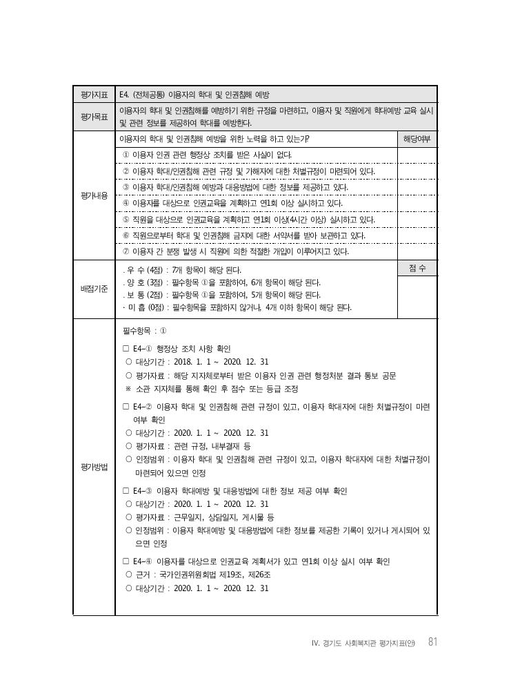 Ⅳ. 경기도 사회복지관 평가지표(안) 81 평가지표 E4. (전체공통) 이용자의 학대 및 인권침해 예방 평가목표 이용자의 학대 및 인권침해를 예방하기 위한 규정을 마련하고, 이용자 및 직원에게 학대예방 교육 실시 및 관련 정보를 제공하여 학대를 예방한다. 평가내용 이용자의 학대 및 인권침해 예방을 위한 노력을 하고 있는가? 해당여부 ① 이용자 인권 관련 행정상 조치를 받은 사실이 없다. ② 이용자 학대/인권침해 관련 규정 및 가해자에 대한 처벌규정이 마련되어 있다. ③ 이용자 학대/인권침해 예방과 대응방법에 대한 정보를 제공하고 있다. ④ 이용자를 대상으로 인권교육을 계획하고 연1회 이상 실시하고 있다. ⑤ 직원을 대상으로 인권교육을 계획하고 연1회 이상(4시간 이상) 실시하고 있다. ⑥ 직원으로부터 학대 및 인권침해 금지에 대한 서약서를 받아 보관하고 있다. ⑦ 이용자 간 분쟁 발생 시 직원에 의한 적절한 개입이 이루어지고 있다. 배점기준 ․ 우 수 (4점) : 7개 항목이 해당 된다. ․ 양 호 (3점) : 필수항목 ①을 포함하여, 6개 항목이 해당 된다. ․ 보 통 (2점) : 필수항목 ①을 포함하여, 5개 항목이 해당 된다. · 미 흡 (0점) : 필수항목을 포함하지 않거나, 4개 이하 항목이 해당 된다. 점 수 평가방법 필수항목 : ① □ E4-① 행정상 조치 사항 확인 ○ 대상기간 : 2018. 1. 1 ~ 2020. 12. 31 ○ 평가자료 : 해당 지자체로부터 받은 이용자 인권 관련 행정처분 결과 통보 공문 ※ 소관 지자체를 통해 확인 후 점수 또는 등급 조정 □ E4-② 이용자 학대 및 인권침해 관련 규정이 있고, 이용자 학대자에 대한 처벌규정이 마련 여부 확인 ○ 대상기간 : 2020. 1. 1 ~ 2020. 12. 31 ○ 평가자료 : 관련 규정, 내부결재 등 ○ 인정범위 : 이용자 학대 및 인권침해 관련 규정이 있고, 이용자 학대자에 대한 처벌규정이 마련되어 있으면 인정 □ E4-③ 이용자 학대예방 및 대응방법에 대한 정보 제공 여부 확인 ○ 대상기간 : 2020. 1. 1 ~ 2020. 12. 31 ○ 평가자료 : 근무일지, 상담일지, 게시물 등 ○ 인정범위 : 이용자 학대예방 및 대응방법에 대한 정보를 제공한 기록이 있거나 게시되어 있 으면 인정 □ E4-④ 이용자를 대상으로 인권교육 계획서가 있고 연1회 이상 실시 여부 확인 ○ 근거 : 국가인권위원회법 제19조, 제26조 ○ 대상기간 : 2020. 1. 1 ~ 2020. 12. 31