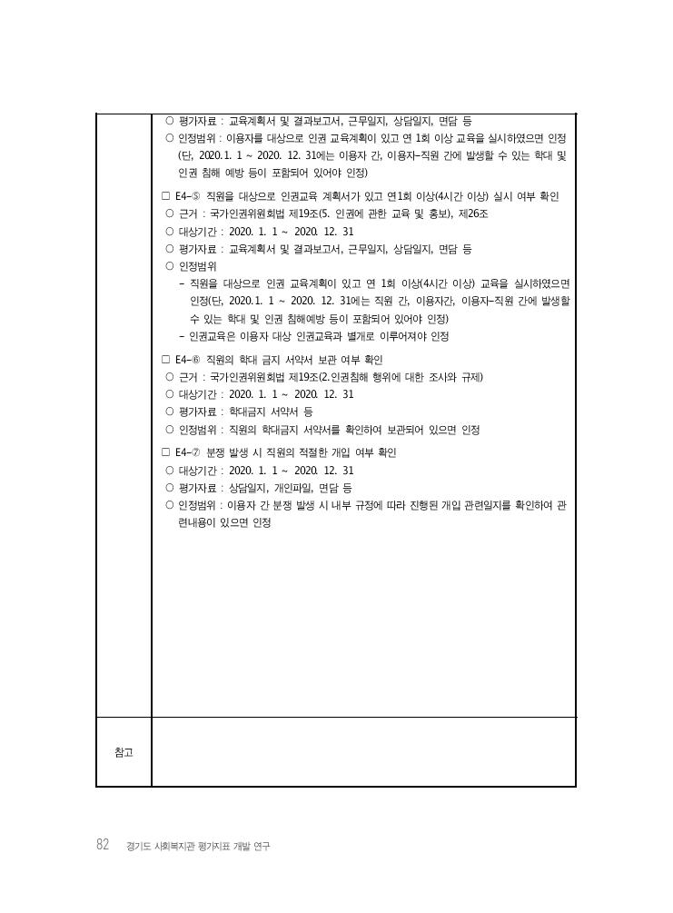82 경기도 사회복지관 평가지표 개발 연구 ○ 평가자료 : 교육계획서 및 결과보고서, 근무일지, 상담일지, 면담 등 ○ 인정범위 : 이용자를 대상으로 인권 교육계획이 있고 연 1회 이상 교육을 실시하였으면 인정 (단, 2020.1. 1 ~ 2020. 12. 31에는 이용자 간, 이용자-직원 간에 발생할 수 있는 학대 및 인권 침해 예방 등이 포함되어 있어야 인정) □ E4-⑤ 직원을 대상으로 인권교육 계획서가 있고 연1회 이상(4시간 이상) 실시 여부 확인 ○ 근거 : 국가인권위원회법 제19조(5. 인권에 관한 교육 및 홍보), 제26조 ○ 대상기간 : 2020. 1. 1 ~ 2020. 12. 31 ○ 평가자료 : 교육계획서 및 결과보고서, 근무일지, 상담일지, 면담 등 ○ 인정범위 - 직원을 대상으로 인권 교육계획이 있고 연 1회 이상(4시간 이상) 교육을 실시하였으면 인정(단, 2020.1. 1 ~ 2020. 12. 31에는 직원 간, 이용자간, 이용자-직원 간에 발생할 수 있는 학대 및 인권 침해예방 등이 포함되어 있어야 인정) - 인권교육은 이용자 대상 인권교육과 별개로 이루어져야 인정 □ E4-⑥ 직원의 학대 금지 서약서 보관 여부 확인 ○ 근거 : 국가인권위원회법 제19조(2.인권침해 행위에 대한 조사와 규제) ○ 대상기간 : 2020. 1. 1 ~ 2020. 12. 31 ○ 평가자료 : 학대금지 서약서 등 ○ 인정범위 : 직원의 학대금지 서약서를 확인하여 보관되어 있으면 인정 □ E4-⑦ 분쟁 발생 시 직원의 적절한 개입 여부 확인 ○ 대상기간 : 2020. 1. 1 ~ 2020. 12. 31 ○ 평가자료 : 상담일지, 개인파일, 면담 등 ○ 인정범위 : 이용자 간 분쟁 발생 시 내부 규정에 따라 진행된 개입 관련일지를 확인하여 관 련내용이 있으면 인정 참고