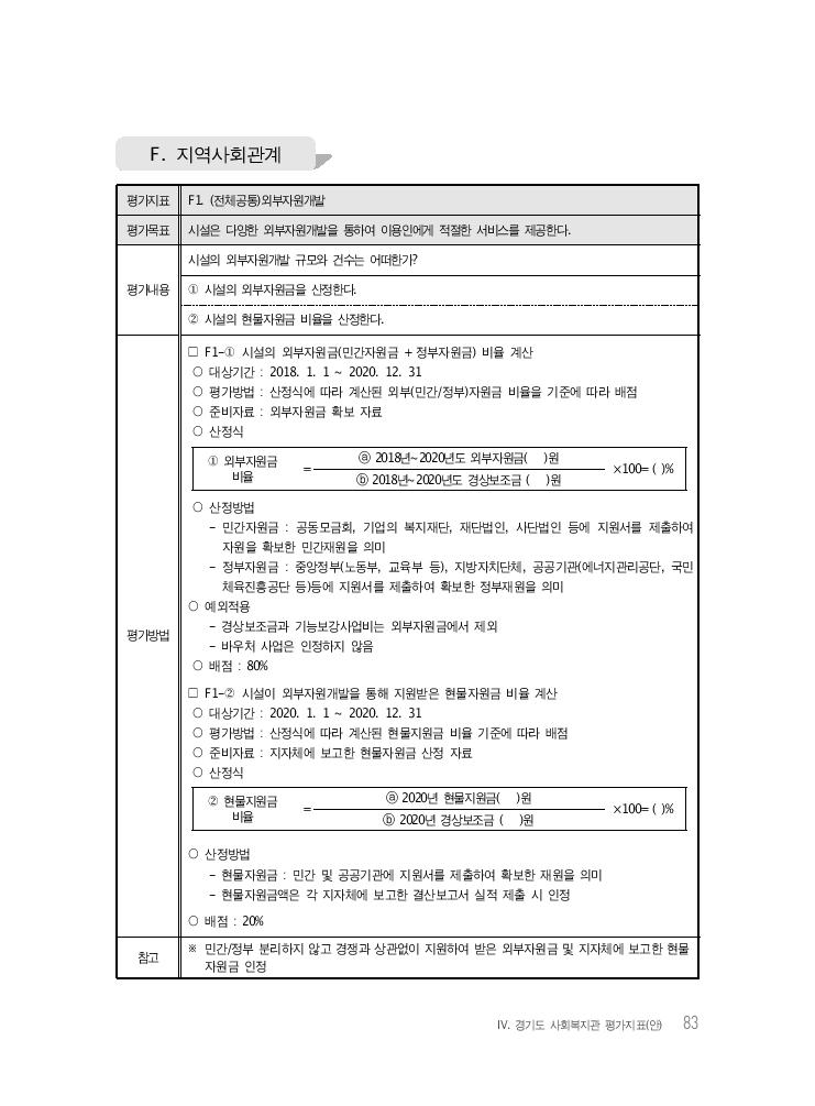 Ⅳ. 경기도 사회복지관 평가지표(안) 83 평가지표 F1. (전체공통)외부자원개발 평가목표 시설은 다양한 외부자원개발을 통하여 이용인에게 적절한 서비스를 제공한다. 평가내용 시설의 외부자원개발 규모와 건수는 어떠한가? ① 시설의 외부자원금을 산정한다. ② 시설의 현물자원금 비율을 산정한다. 평가방법 □ F1-① 시설의 외부자원금(민간자원금 + 정부자원금) 비율 계산 ○ 대상기간 : 2018. 1. 1 ~ 2020. 12. 31 ○ 평가방법 : 산정식에 따라 계산된 외부(민간/정부)자원금 비율을 기준에 따라 배점 ○ 준비자료 : 외부자원금 확보 자료 ○ 산정식 ① 외부자원금 비율 = ⓐ 2018년~2020년도 외부자원금( )원 ×100= ( )%ⓑ 2018년~2020년도 경상보조금 ( )원 ○ 산정방법 - 민간자원금 : 공동모금회, 기업의 복지재단, 재단법인, 사단법인 등에 지원서를 제출하여 자원을 확보한 민간재원을 의미 - 정부자원금 : 중앙정부(노동부, 교육부 등), 지방자치단체, 공공기관(에너지관리공단, 국민 체육진흥공단 등)등에 지원서를 제출하여 확보한 정부재원을 의미 ○ 예외적용 - 경상보조금과 기능보강사업비는 외부자원금에서 제외 - 바우처 사업은 인정하지 않음 ○ 배점 : 80% □ F1-② 시설이 외부자원개발을 통해 지원받은 현물자원금 비율 계산 ○ 대상기간 : 2020. 1. 1 ~ 2020. 12. 31 ○ 평가방법 : 산정식에 따라 계산된 현물지원금 비율 기준에 따라 배점 ○ 준비자료 : 지자체에 보고한 현물자원금 산정 자료 ○ 산정식 ② 현물지원금 비율 = ⓐ 2020년 현물지원금( )원 ×100= ( )%ⓑ 2020년 경상보조금 ( )원 ○ 산정방법 - 현물자원금 : 민간 및 공공기관에 지원서를 제출하여 확보한 재원을 의미 - 현물자원금액은 각 지자체에 보고한 결산보고서 실적 제출 시 인정 ○ 배점 : 20% 참고 ※ 민간/정부 분리하지 않고 경쟁과 상관없이 지원하여 받은 외부자원금 및 지자체에 보고한 현물자원금 인정 F. 지역사회관계