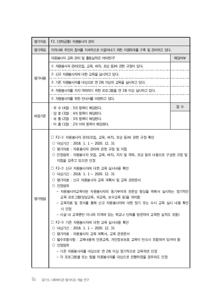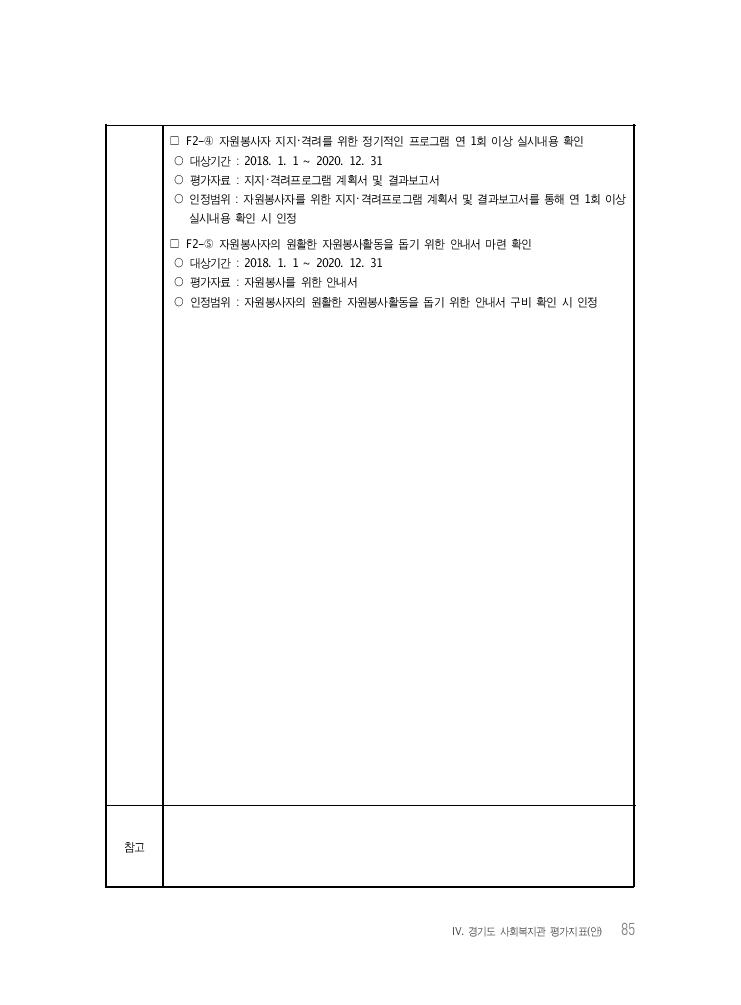 Ⅳ. 경기도 사회복지관 평가지표(안) 85 □ F2-④ 자원봉사자 지지・격려를 위한 정기적인 프로그램 연 1회 이상 실시내용 확인 ○ 대상기간 : 2018. 1. 1 ~ 2020. 12. 31 ○ 평가자료 : 지지・격려프로그램 계획서 및 결과보고서 ○ 인정범위 : 자원봉사자를 위한 지지・격려프로그램 계획서 및 결과보고서를 통해 연 1회 이상 실시내용 확인 시 인정 □ F2-⑤ 자원봉사자의 원활한 자원봉사활동을 돕기 위한 안내서 마련 확인 ○ 대상기간 : 2018. 1. 1 ~ 2020. 12. 31 ○ 평가자료 : 자원봉사를 위한 안내서 ○ 인정범위 : 자원봉사자의 원활한 자원봉사활동을 돕기 위한 안내서 구비 확인 시 인정 참고